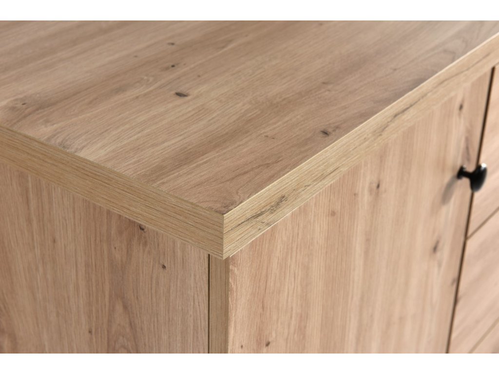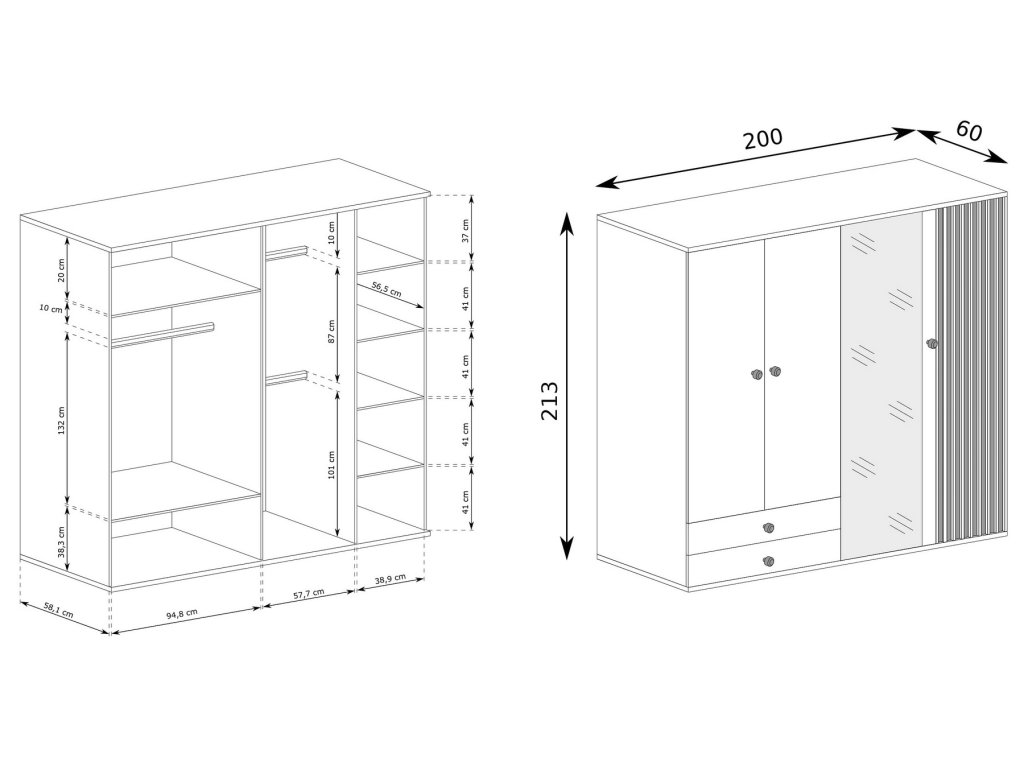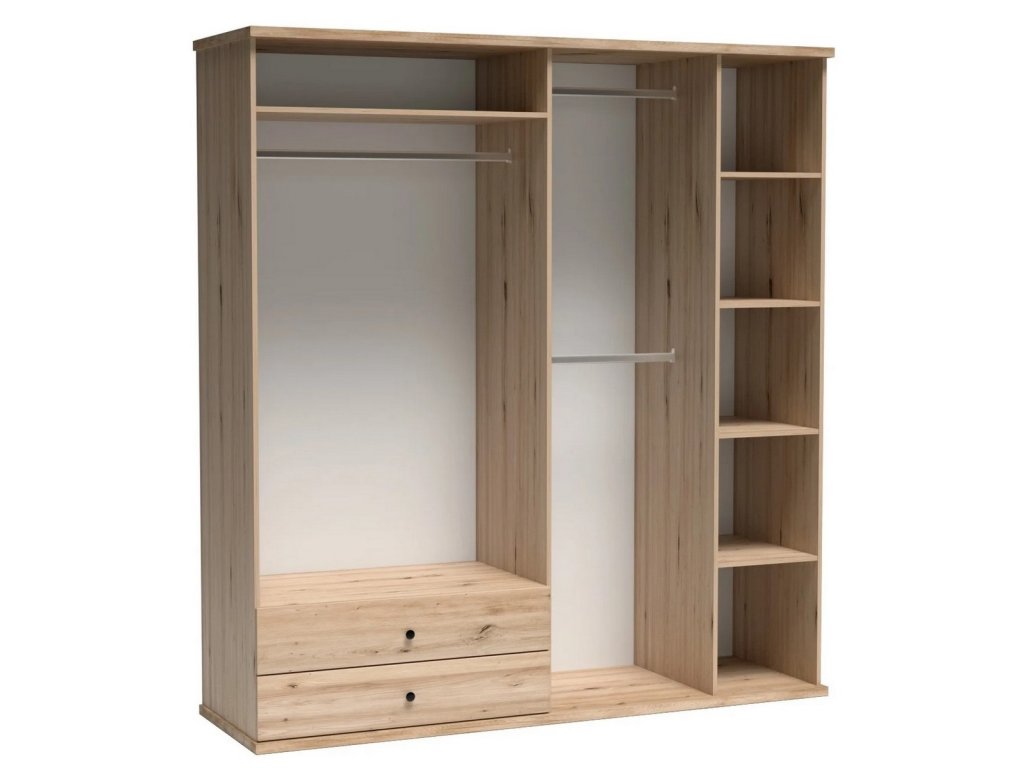 Šatni skříň čtyřdeřová s dvěmi zásuvkami a netradičním provedením detailu dvířek s lamelami. Kolekce nábytku v sobě spojuje jednoduchost, originální vzhled a funkčnost. Barevné provedení je v kombinaci dub artisan/černá mat. Nábytek je vyroben z kvalitního lamina ohraničeného ABS páskou, dekorační lamely jsou vyrobeny z desky MDF. Uvnitř skříně viz obrázek, Možnost dokoupit další police. Skříň obsahuje zrcadlo. Kolekce se skládá z mnoha prvků a tento široký výběr Vám zaručí sestavit si nábytek podle svých vlastních představ a přání. Dodáváme v demontovaném stavu.