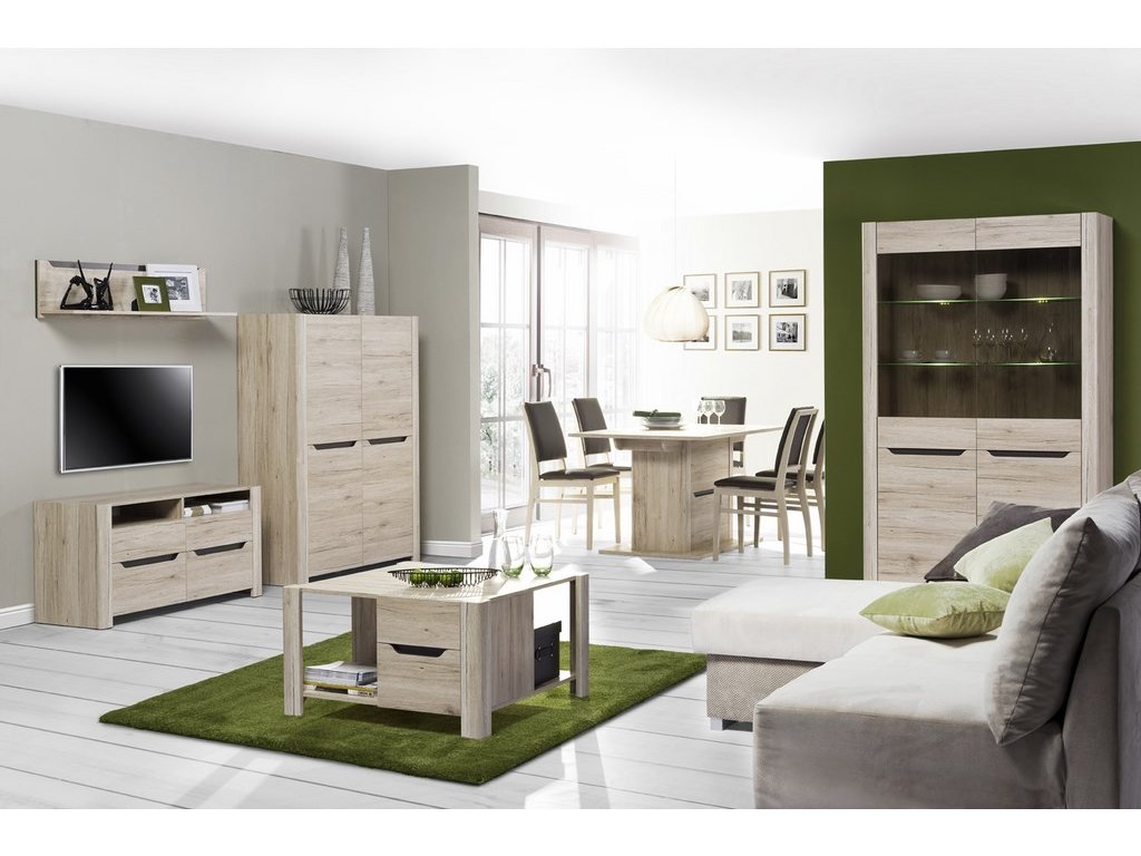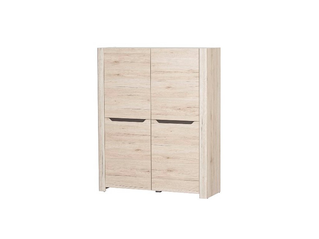 Komoda dvoudveřová ze sektorové řady DESJO. Tento moderní nábytek je součástí sestavy určené do jídelny nebo obývacího pokoje. Celá řada se vyznačuje úspěšnou kombinací současné a moderní přírodní formy. Jednoduchý styl umocňuje senzační bezúchytový systém nábytku. Vyrábí se z vysoce kvalitní dýhované dřevotřískové desky s fólií. Dekor s 3D efektem vizuálně dává dojem hlubokého povrchu. Široký výběr vám zaručí si sestavit nábytek podle svých představ. Barevné provedení je dub sanremo s dekorativním proužkem hnědé barvy. Nábytek se dodává v demontovaném stavu. Výrobce doporučuje vysoký nábytek připevnit ke stěně.Doplňkové parametry