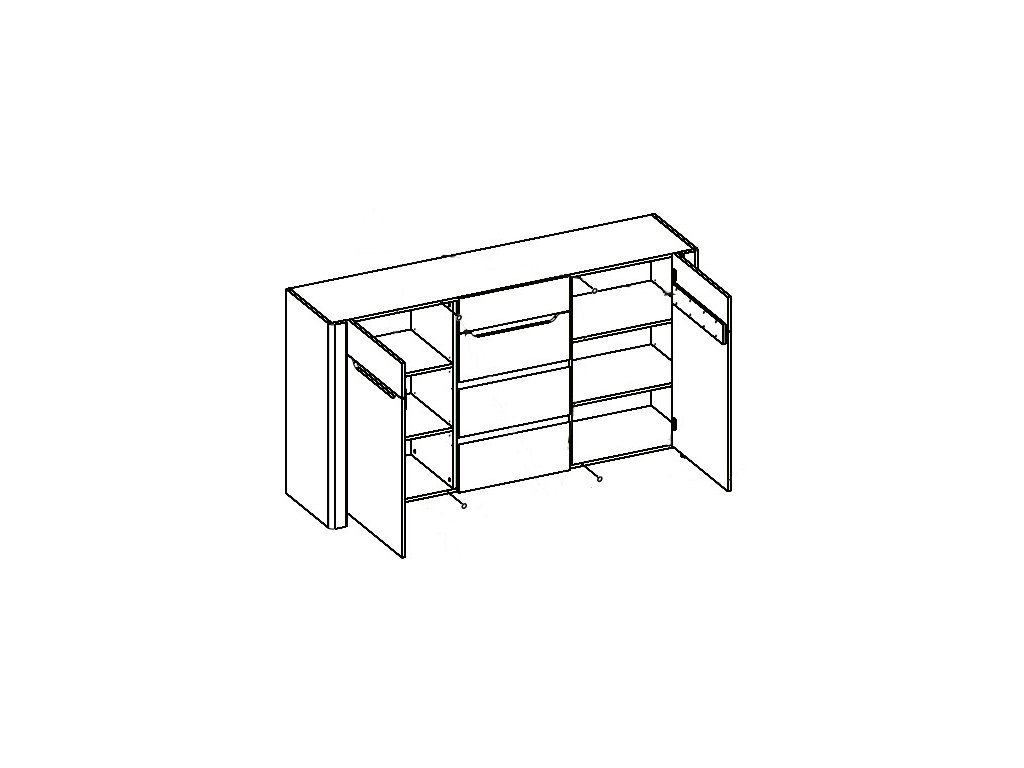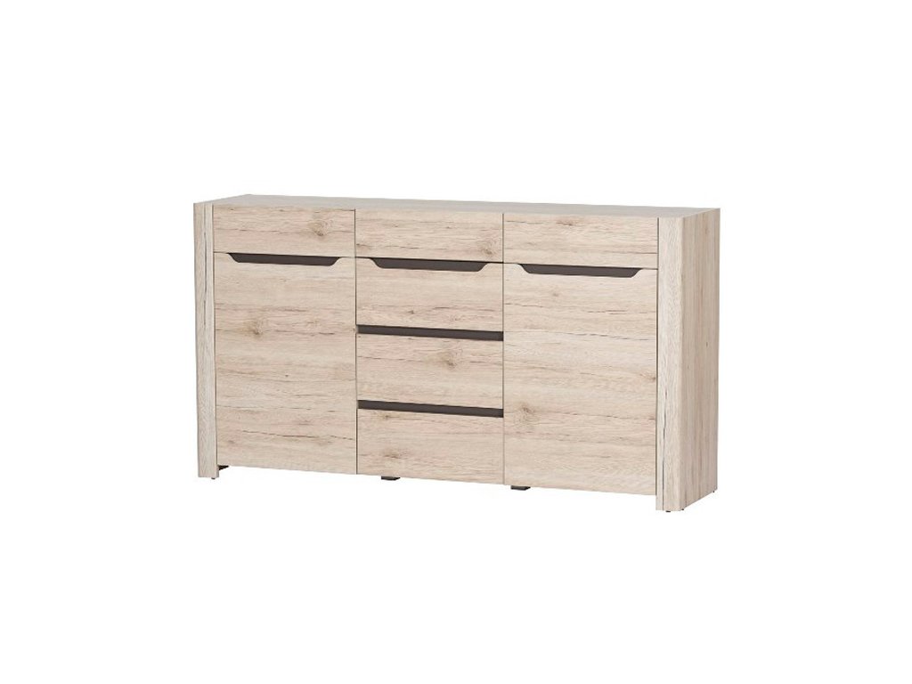 Komoda dvoudveřová se 4 zásuvkami ze sektorové řady DESJO. Tento moderní nábytek je součástí sestavy určené do jídelny nebo obývacího pokoje. Celá řada se vyznačuje úspěšnou kombinací současné a moderní přírodní formy. Jednoduchý styl umocňuje senzační bezúchytový systém nábytku. Vyrábí se z vysoce kvalitní dýhované dřevotřískové desky s fólií. Dekor s 3D efektem vizuálně dává dojem hlubokého povrchu. Široký výběr vám zaručí si sestavit nábytek podle svých představ. Barevné provedení je dub sanremo s dekorativním proužkem hnědé barvy. Nábytek se dodává v demontovaném stavu.Doplňkové parametry