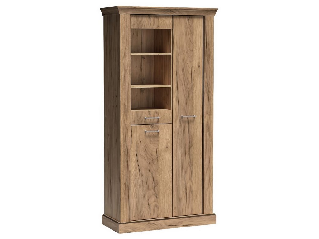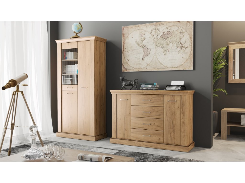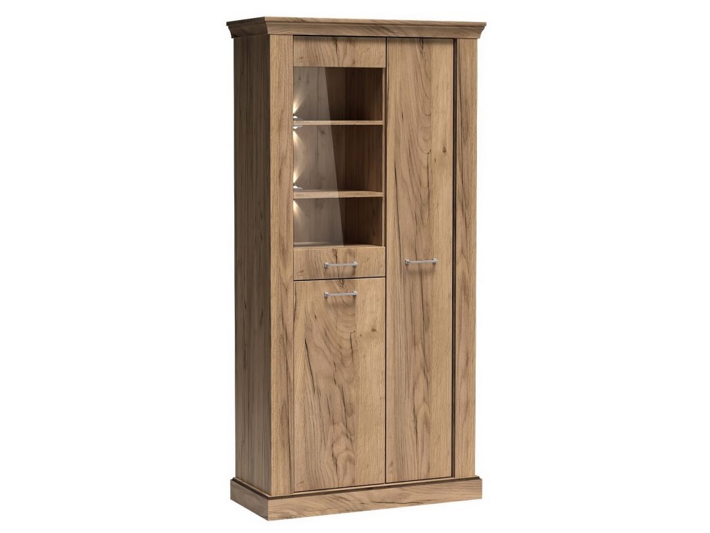 Vitrína ze sektorové řady má 3 dvířka, z toho jedny jsou prosklené. Kolekce nábytku v sobě spojuje jednoduchost, krásný vzhled a funkčnost. Jedná se o stylovou kolekci nábytku rustikálního stylu, který je vhodný jak do ložnice tak do obývacího pokoje. Jeho barevné provedení vnese do domova lehkost a eleganci. Barevné provedení - dub zlatý kraft. Nábytek je vyroben z kvalitního lamina ohraničeného ABS páskou. Kolekce se skládá z mnoha prvků a tento široký výběr vám zaručí sestavit si nábytek podle svých vlastních představ a přání. Možnost dokoupení LED osvětlení do vitríny. Dodáváme v demontovaném stavu.Doplňkové parametry