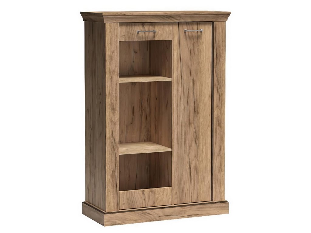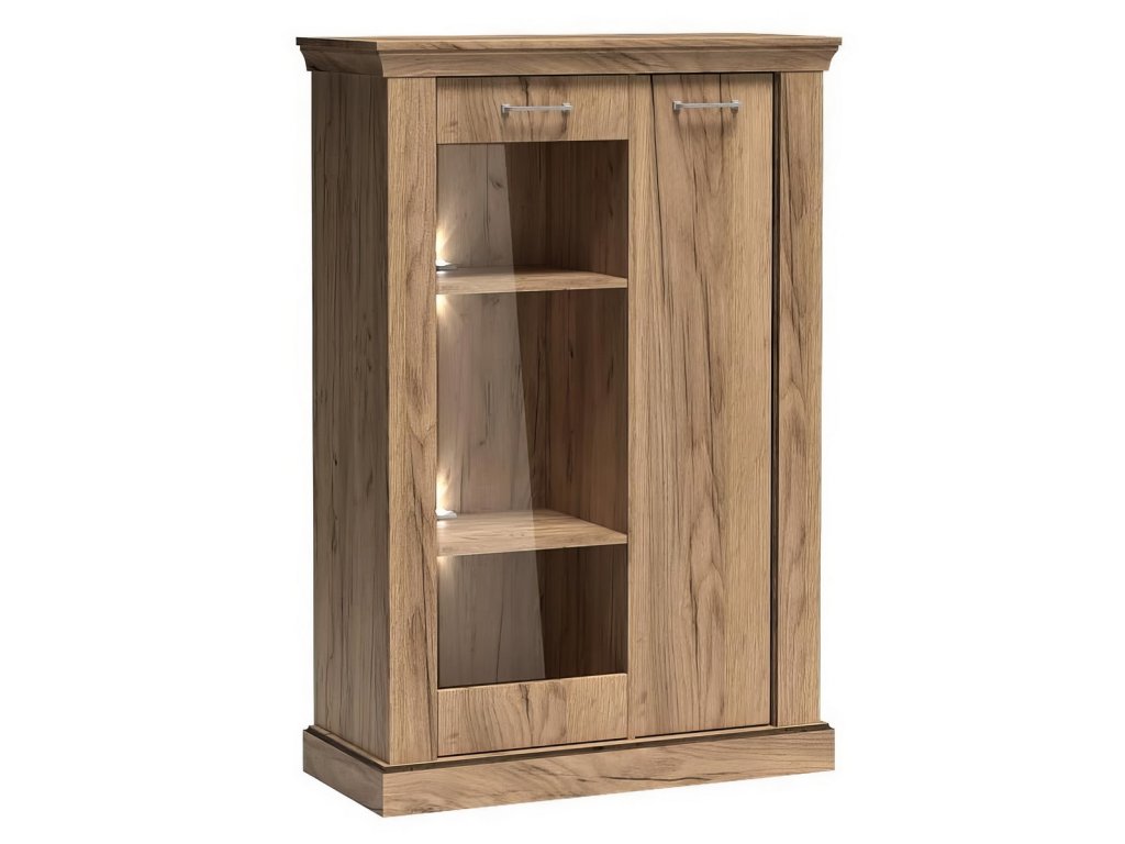 Vitrína ze sektorové řady má 2 dvířka, z toho jedny jsou prosklené. Kolekce nábytku v sobě spojuje jednoduchost, krásný vzhled a funkčnost. Jedná se o stylovou kolekci nábytku rustikálního stylu, který je vhodný jak do ložnice tak do obývacího pokoje. Jeho barevné provedení vnese do domova lehkost a eleganci. Barevné provedení - dub zlatý kraft. Nábytek je vyroben z kvalitního lamina ohraničeného ABS páskou. Možnost dokoupení LED osvětlení do vitríny. Kolekce se skládá z mnoha prvků a tento široký výběr vám zaručí sestavit si nábytek podle svých vlastních představ a přání. Dodáváme v demontovaném stavu.Doplňkové parametry