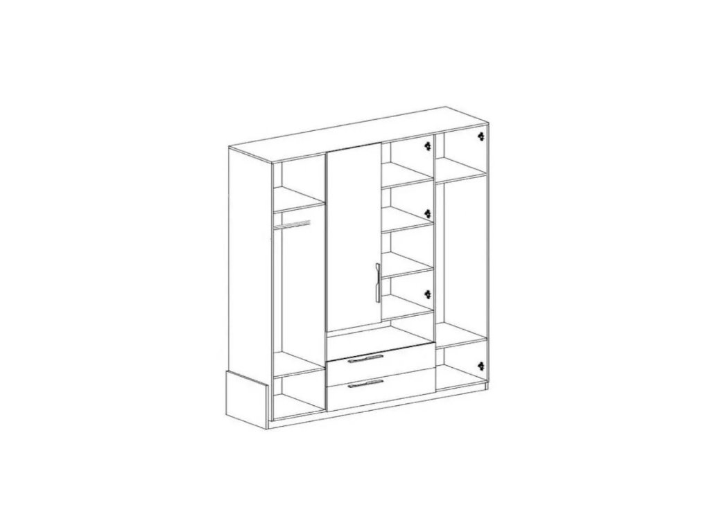 Skříň se skládá z čtyřdveřové části. Vybavená je dvěma zásuvkami, nad kterými se nachází otevřený výklenek. Uvnitř se nacházejí dvě tyče na věšáky, umístěné jak na levé, tak i na pravé straně. Střední část jsou police na oblečení