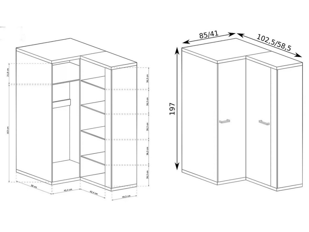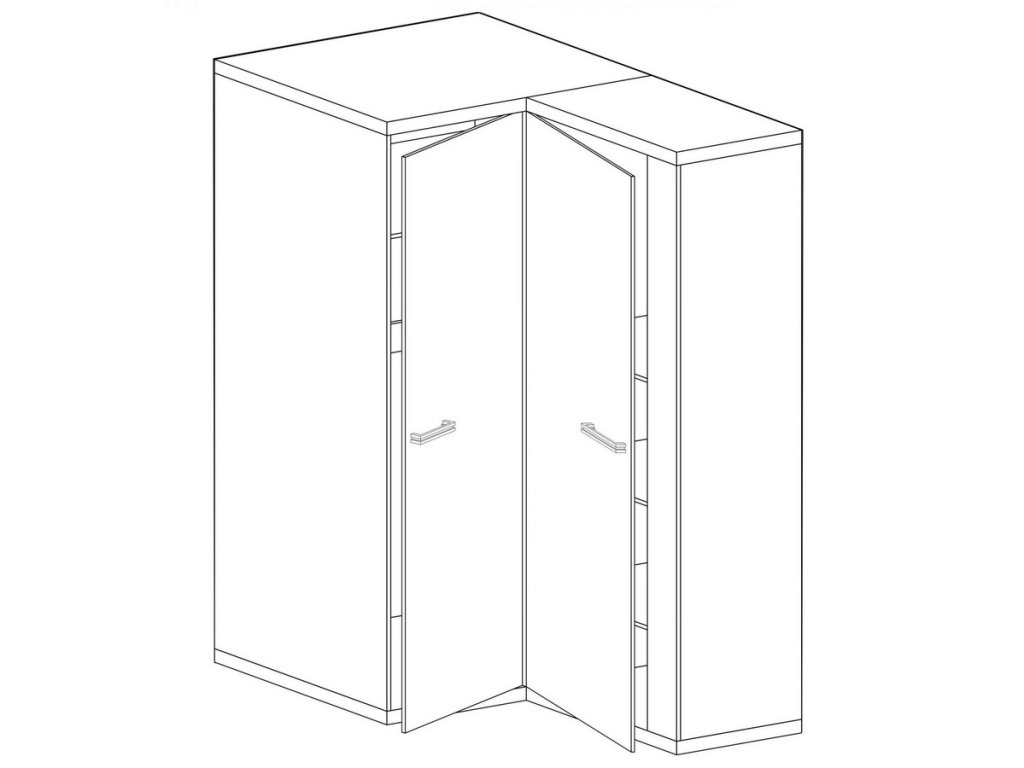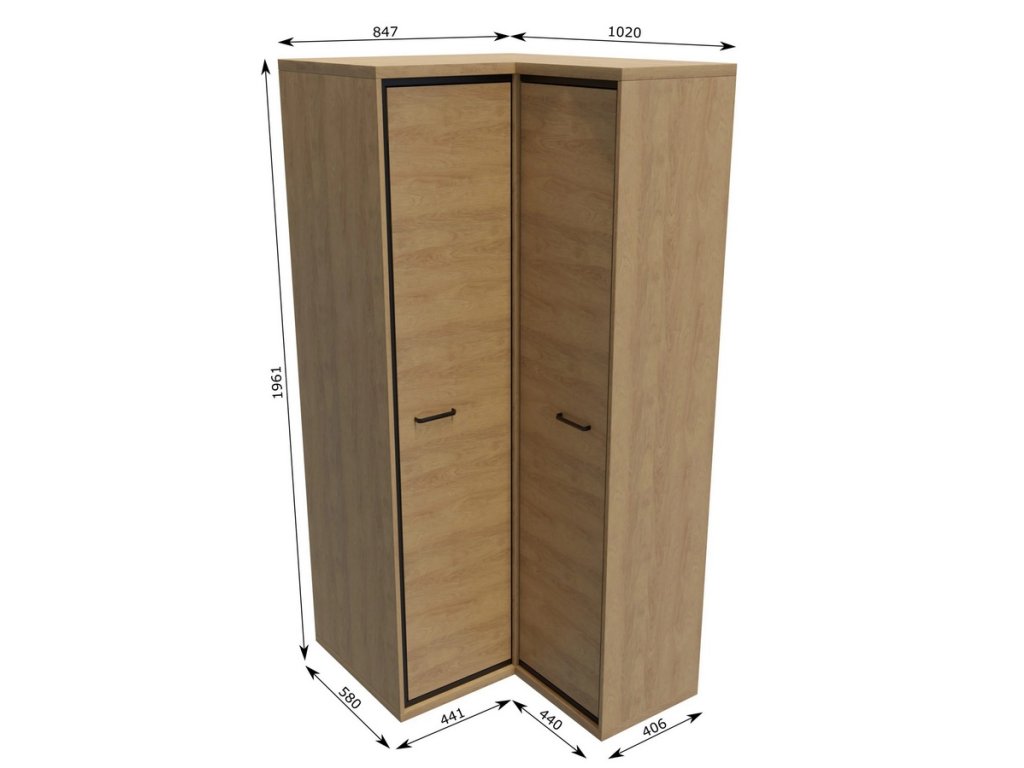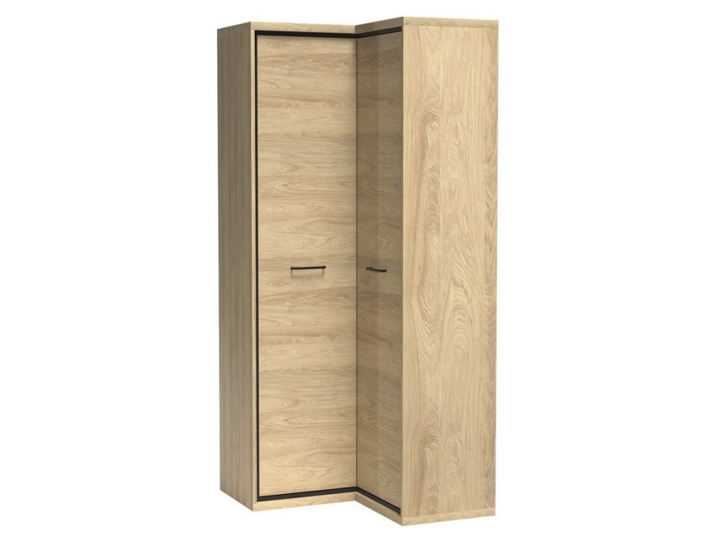 Rohová šatní skříň dvoudveřová v industriálním stylu v barevném provedení dub hickory, doplněno prvky v černé barvě. Nábytek je vyroben z kvalitního lamina ohraničeného ABS páskou a také je vybaven systémem tichého dovírání. Úchyty jsou černé kovové. Uvnitř skříně je šatní tyč a police. Možnost dokoupení dalších polic. Kolekce se skládá z mnoha prvků a tento široký výběr Vám zaručí sestavit si nábytek podle svých vlastních představ a přání. Dodáváme v demontovaném stavu.Doplňkové parametry