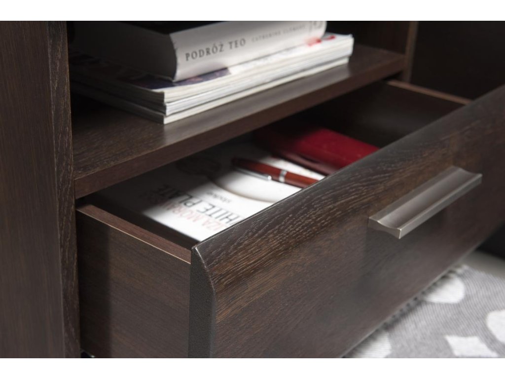 Noční stolek se zásuvkou ze sektorové řady PORTI značkového výrobce Szynaka. Systém PORTI je exkluzivní kolekce navržena v moderním duchu. Struktura ušlechtilého masivního dubu na přední straně a přírodní dýha na korpusu zdůrazňuje velmi klasickou barvu čokoládový dub. Opakující se prvek riflování v kombinaci s černým sklem je dekorační motiv, který se odráží v každém bloku. Celá řada se vyznačuje elegancí a jednoduchými tvary, které zaručují plné využití prostoru. Barevné provedení - čokoládový dub. Elegantní úchyty jsou z kovu. Dodáváme ve smontovaném stavu.Doplňkové parametry