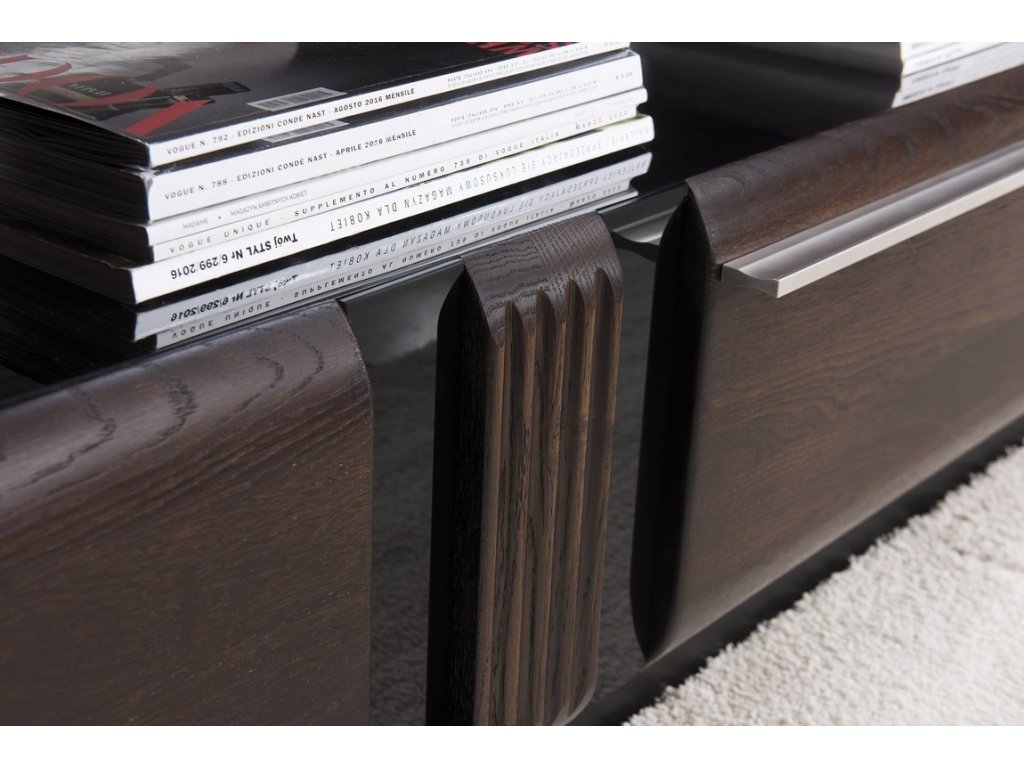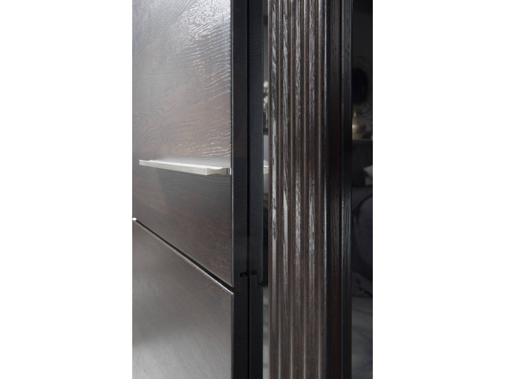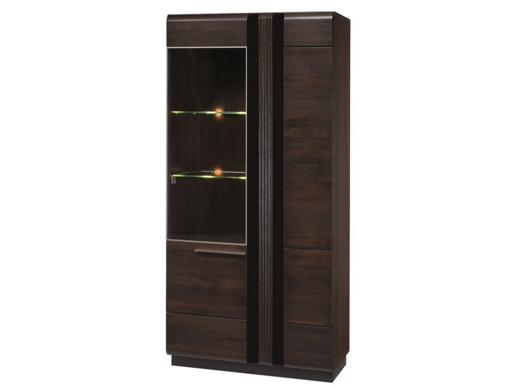 Široká vitrína ze sektorové řady PORTI značkového výrobce Szynaka. Vitrína má 2 dvířka. Systém PORTI je exkluzivní kolekce navržena v moderním duchu. Struktura ušlechtilého masivního dubu na přední straně a přírodní dýha na korpusu zdůrazňuje velmi klasickou barvu čokoládový dub. Opakující se prvek riflování v kombinaci s černým sklem je dekorační motiv, který se odráží v každém bloku. LED osvětlení vitrín lze dokoupit. Použitelnost alternativního spínače zjednoduší každodenní používání a osvětlený vnitřek vybraných bloků přinese ještě více energie a radosti v každodenním životě a nenápadně upozorní na povahu exponovaných prvků. Celá řada se vyznačuje elegancí a jednoduchými tvary, které zaručují plné využití prostoru. Barevné provedení - čokoládový dub. Elegantní úchyty jsou z kovu. Dodáváme ve smontovaném stavu.Doplňkové parametry