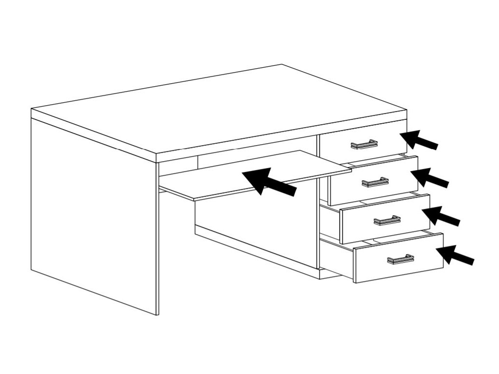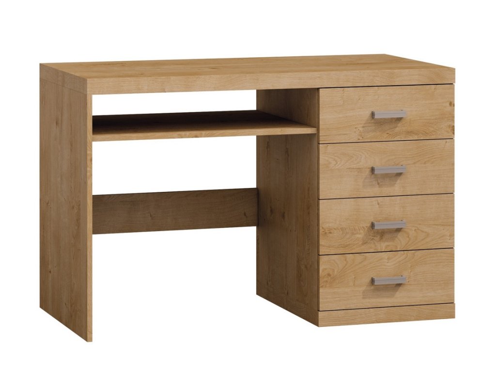 Pracovní stůl má 4 praktické zásuvky a poličku. Jedná se o stylovou kolekci nábytku moderního stylu, který je vhodný do obývacího pokoje a ložnice. Barevné provedení dub ribbeck. Nábytek je vyroben z kvalitního lamina 16 mm, některé desky jsou zesíleny na 48 mm, vše ohraničené ABS páskou. Zásuvky jsou opatřeny systémem PUSH TO OPEN ( zatlač a otevři ). Dodáváme v demontovaném stavu.Doplňkové parametry