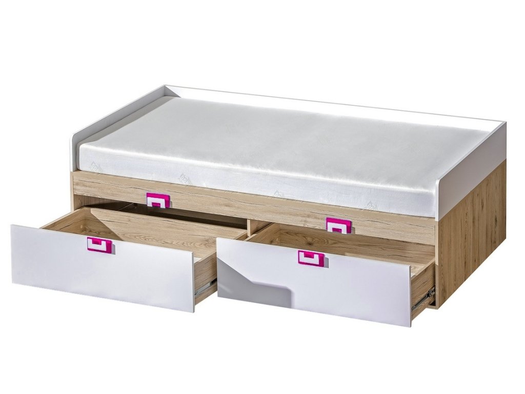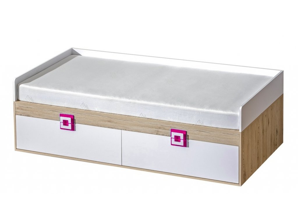 Postel s roštem a úložným prostorem ze sektorové řady NIKO, která se vyznačuje netradičním zpracováním barev a originalitou úchytů. Rošt je v ceně, matraci je třeba doobjednat, vhodný rozměr 90 x 200 cm. Tento styl nábytku zaujme každou mladší generaci. Postel je vyrobena z kvalitní LTD desky hraněné ABS lištou. Korpus je v barvě dub jasný, čela zásuvek jsou v barvě bílá mat. Úchytky jsou v barevné kombinaci růžová / bílá. Součástí postele jsou dvě zásuvky ve spodní části. Sektorový nábytek NIKO má široký výběr prvků, který Vám zaručí sestavit si dětský nebo studentský pokoj, ložnici či kancelář podle svých potřeb, přání a představ. Dodáváme v demontovaném stavu.Doplňkové parametry