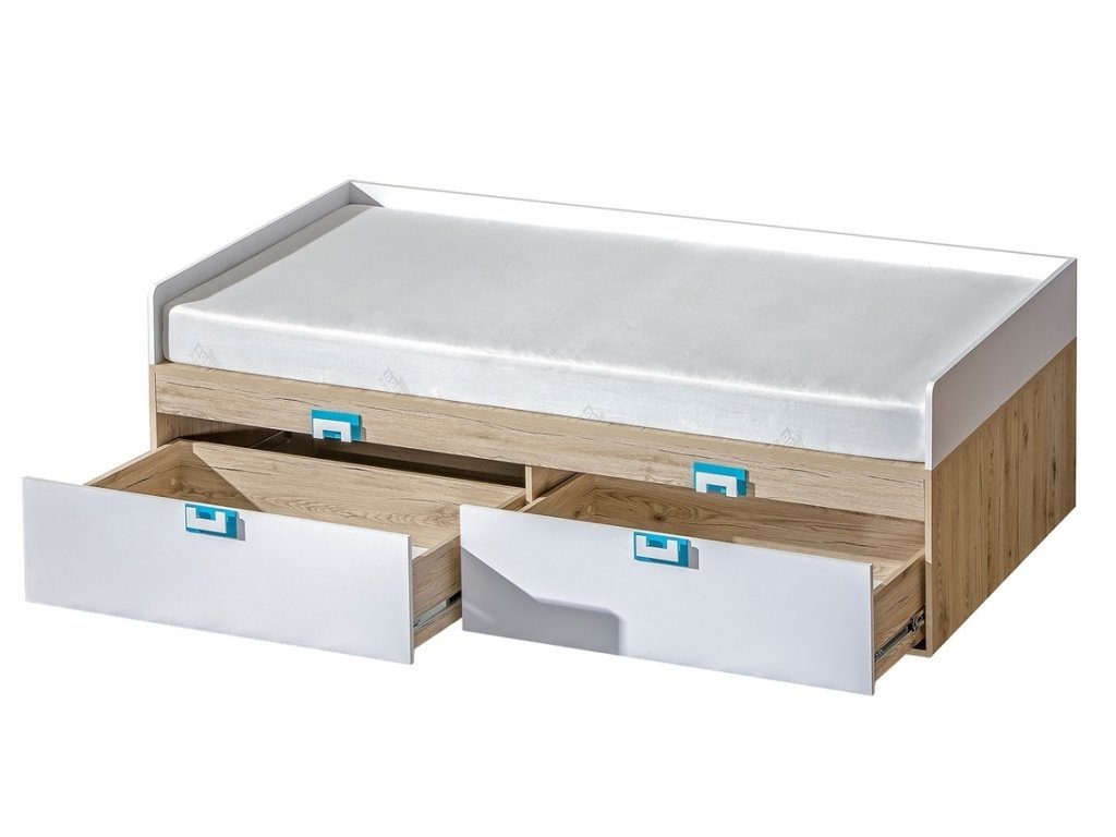 Postel s roštem a úložným prostorem ze sektorové řady NIKO, která se vyznačuje netradičním zpracováním barev a originalitou úchytů. Rošt je v ceně, matraci je třeba doobjednat, vhodný rozměr 90 x 200 cm. Tento styl nábytku zaujme každou mladší generaci. Postel je vyrobena z kvalitní LTD desky hraněné ABS lištou. Korpus je v barvě dub jasný, čela zásuvek jsou v barvě bílá mat. Úchytky jsou v barevné kombinaci tyrkys / bílá. Součástí postele jsou dvě zásuvky ve spodní části. Sektorový nábytek NIKO má široký výběr prvků, který Vám zaručí sestavit si dětský nebo studentský pokoj, ložnici či kancelář podle svých potřeb, přání a představ. Dodáváme v demontovaném stavu.Doplňkové parametry