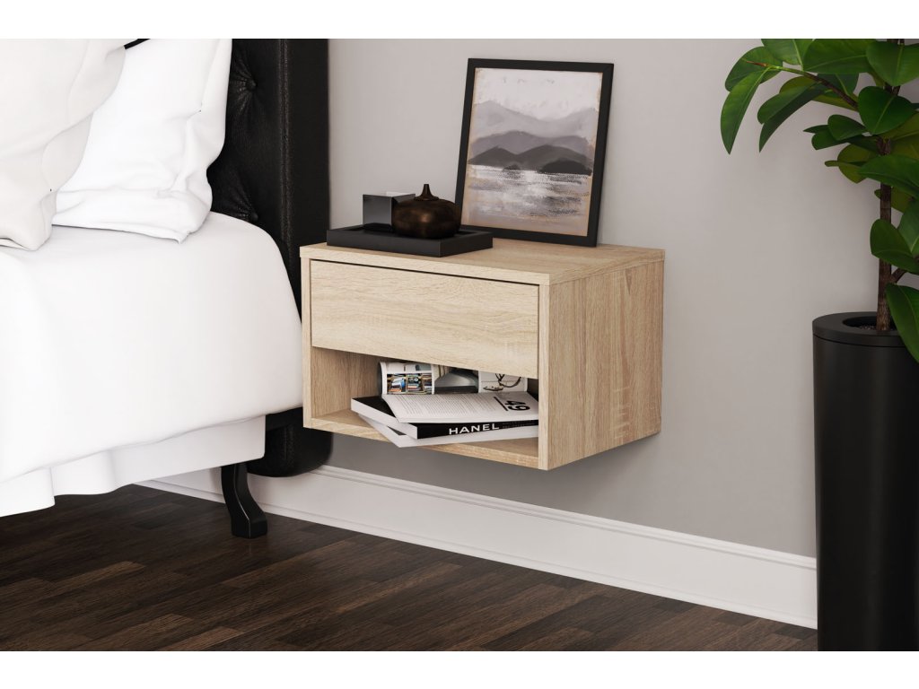 noční stolek je vyroben v minimalistickém designu a představuje praktické řešení odkládacího prostoru pro malé ložnice. noční stolek s čistými liniemi dodá vaší ložnici funkčnost a vzdušný vzhled. Jednoduše jej připevněte na stěnu vedle postele do vámi preferované výšky a nechte, aby se postaral o nezbytnosti, které chcete mít během večera či časného rána u sebe. Stolek obsahuje kromě odkládací police i zásuvku s bezúchytovým otevíráním pro snadný přístup k uloženým předmětům.