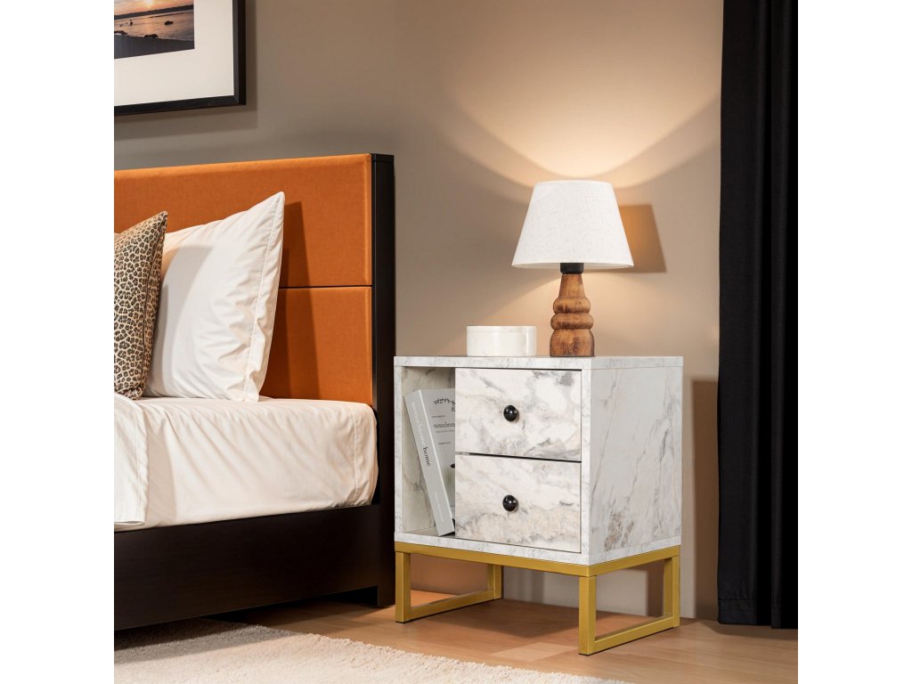 Kombinace luxusních barev frézie, mramoru a zlata vytváří výrazný vizuální dojem, který okamžitě upoutá pozornost. Elegantní kovové nohy dodávají klasickému mramorovému designu moderní nádech, díky čemuž je tento noční stolek dokonalou směsicí tradičního a současného stylu.