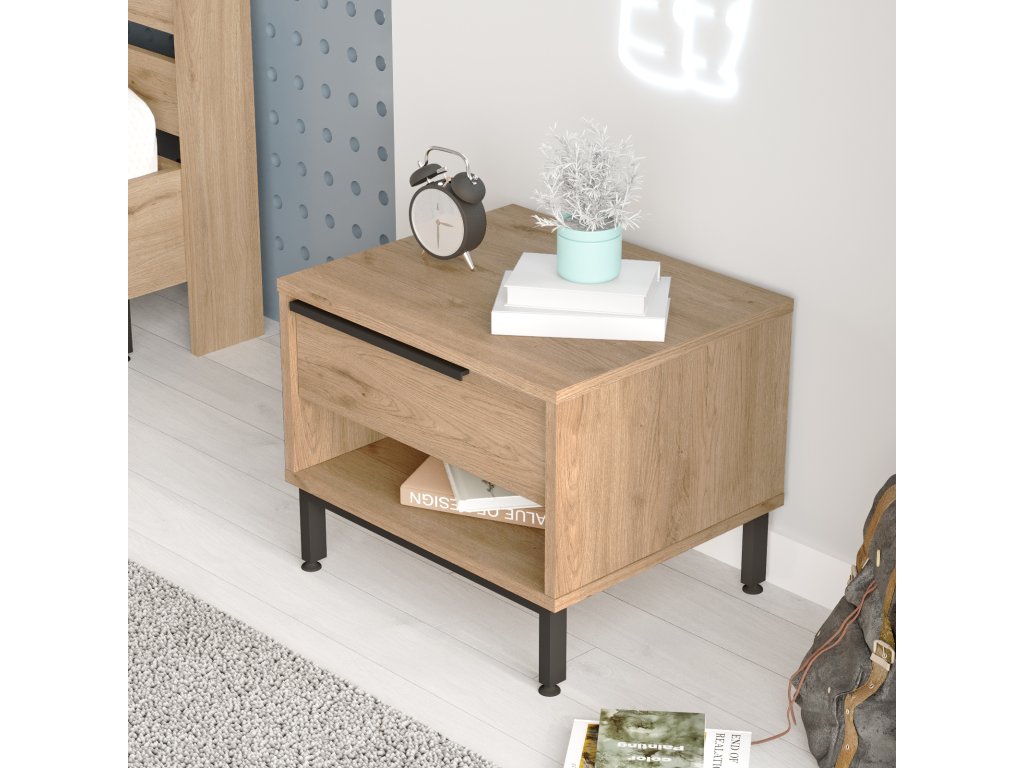 Noční stolek je ideálním doplňkem do moderní ložnice. Spojení kvalitního LTD materiálu a kovu zajišťuje odolnost a atraktivní vzhled. Díky kompaktním rozměrům, jedné zásuvce a regálku nabízí stolek dostatek úložného prostoru pro vaše nezbytnosti a snadno zapadne do jakéhokoli interiéru.