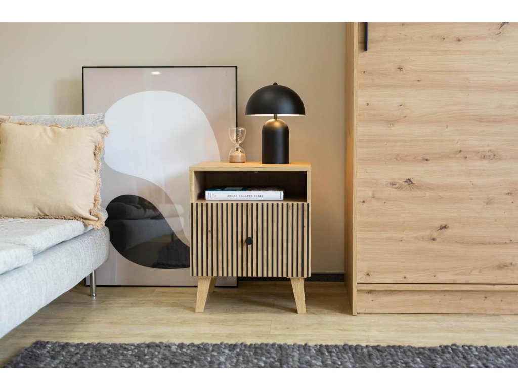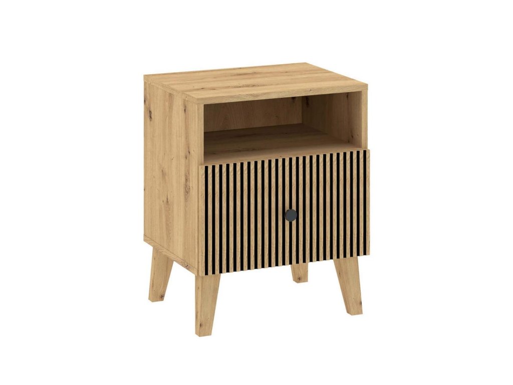 Noční stolek se zásuvkou je vyroben z kvalitní LTD v barevném provedení dub artisan/černá. Netradiční frézování předních dvířek v kombinaci s minimalistickými úchyty a vysokými nožkami, dodává této kolekci moderní vzhled. Nabídka komponentů této sektorové řady umožňuje sestavit si nábytek dle vlastních představ. Dodáváme v demontovaném stavu.Doplňkové parametry