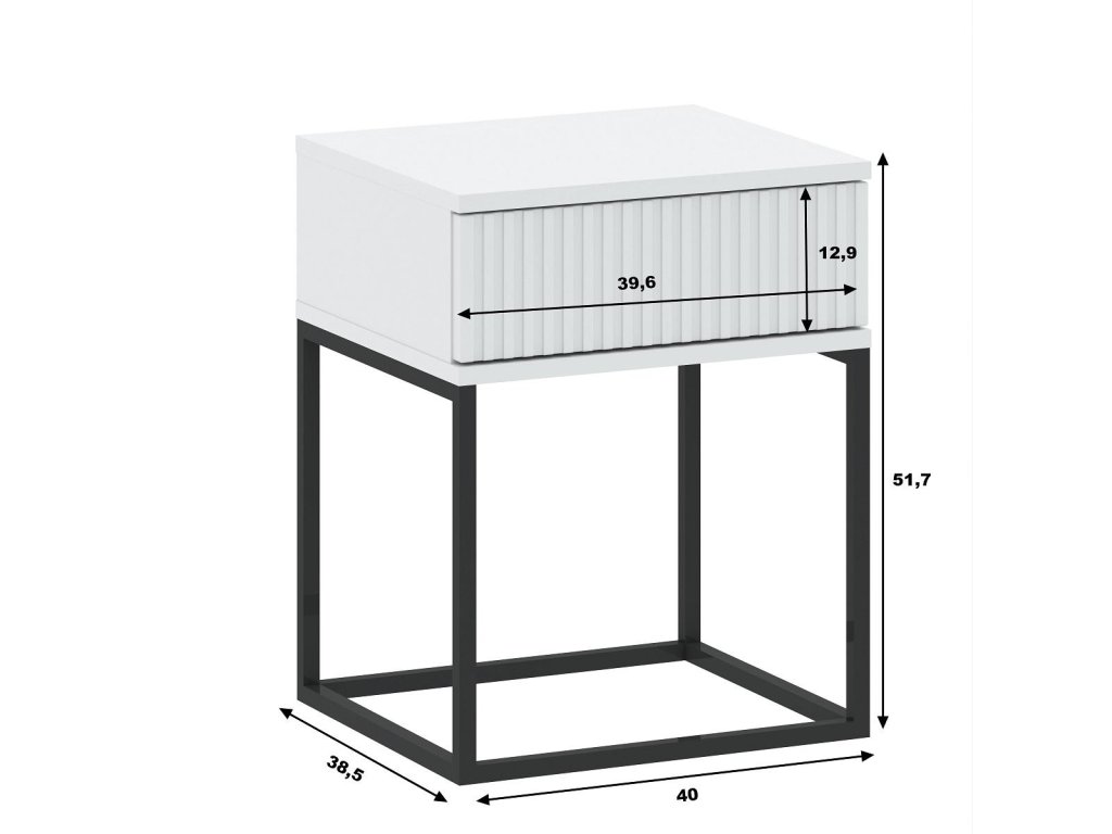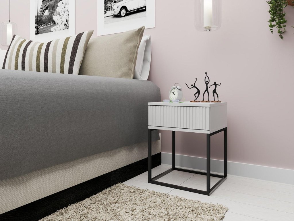 Noční stolek se zásuvkou v loftovém provedení je vyroben z kvalitní LTD desky s ABS hranami v barevném provedení bílá. Netradiční provedení kovové konstrukce nahrazující nožky stolku, je vyrobena z kovu v barvě černé. V nabídce najdete i další noční stolky v jiných provedeních. Dodáváme v demontovaném stavu.Doplňkové parametry