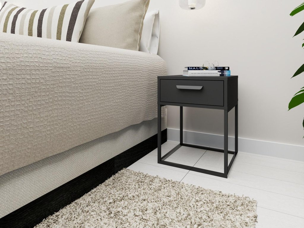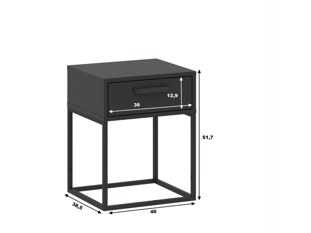 Noční stolek se zásuvkou v loftovém provedení je vyroben z kvalitní LTD desky s ABS hranami v barevném provedení antracit. Netradiční provedení kovové konstrukce nahrazující nožky stolku, je vyrobena z kovu v barvě černé. V nabídce najdete i další noční stolky v jiných provedeních. Dodáváme v demontovaném stavu.Doplňkové parametry