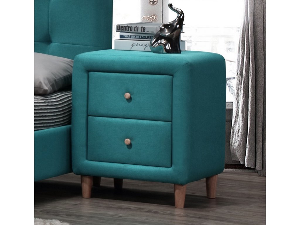 Noční stolek stylového rázu. Je čalouněný kvalitní potahovou látkou v nádherné barvě Tiffany blue tyrkys. Stolek má dvě zásuvky a stojí na dřevěných nožkách. DOPRODEJ!Doplňkové parametry