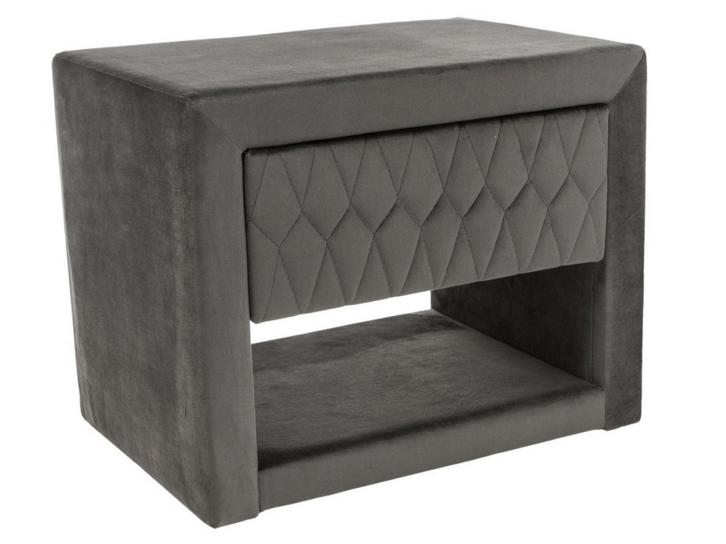 Elegantní noční stolek originálního vzhledu. Konstrukce je potažena látkou aksamit šedé barvy. Stolek má 1 praktickou zásuvku. Stylový doplněk pro každý interiér.Doplňkové parametry