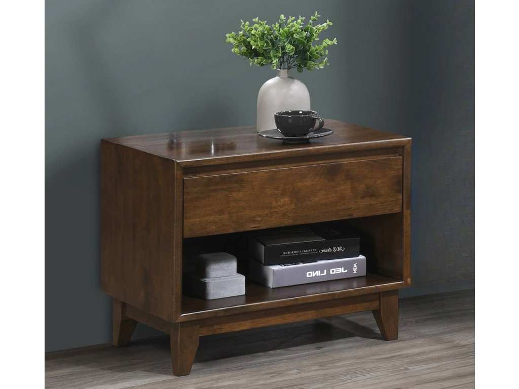 Moderní noční stolek se zásuvkou originálního vzhledu. Konstrukce je ze dřeva v odstínu vlašský ořech. Dodáváme v demontovaném stavu.Doplňkové parametry