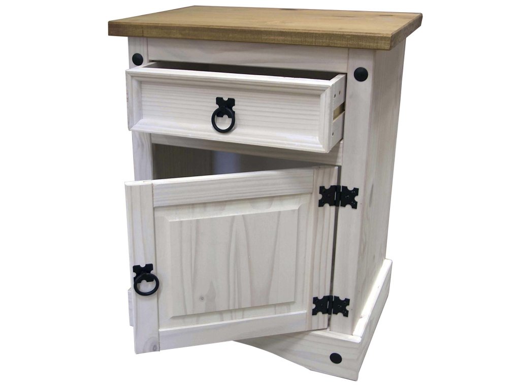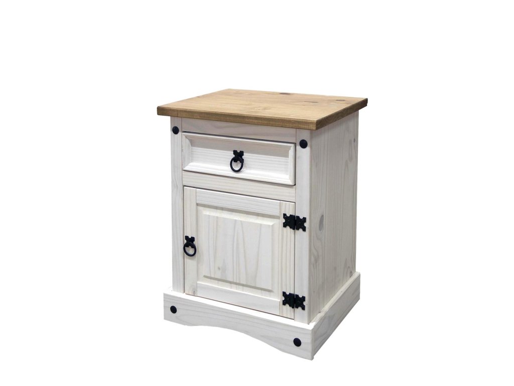 materiál masiv borovice voskovaná v bílém odstínu horní deska masiv borovice voskovaná v medovém odstínu 1 zásuvka, 1 dvířka, hloubka zásuvky 30 cm, kovové ozdobné úchytky možnost montáže pantů na levou i pravou stranu součást sestavy Corona bíláDoplňkové parametry
