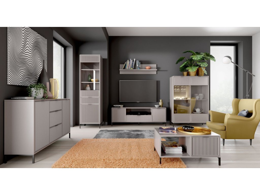 Nábytek je zdoben vzorem na čelních stranách v podobě frézovaných drážek. Všechny kusy nábytku z této kolekce stojí na černých kovových nožkách. Jednoduché a funkční tvary se hodí do obývacího pokoje, ložnice i jídelny.