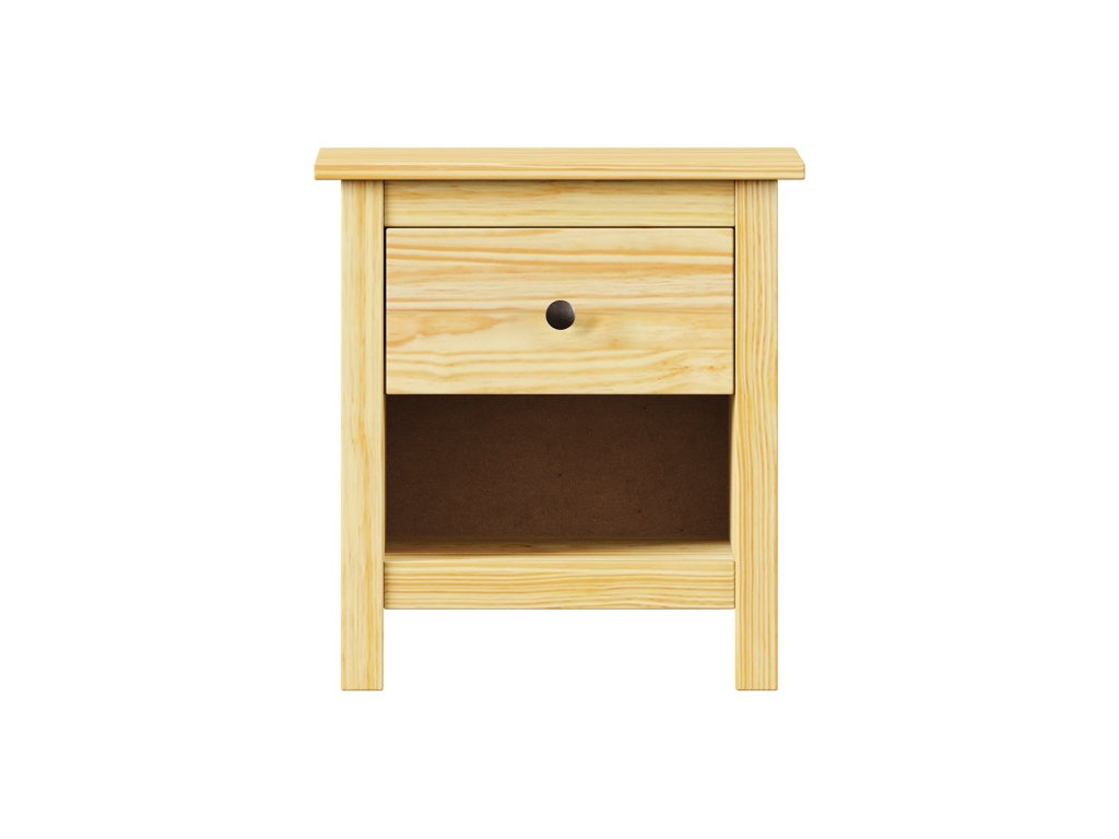 materiál masiv borovice, lakované provedení kovové úchytky v barevném provedení černěná mosaz jedna zásuvka s kovovými pojezdyDoplňkové parametry