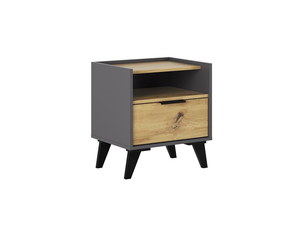 Noční stolek je vyroben v elegantním moderním stylu. Nabízí úložný prostor v podobě praktické zásuvky a odkládací police.