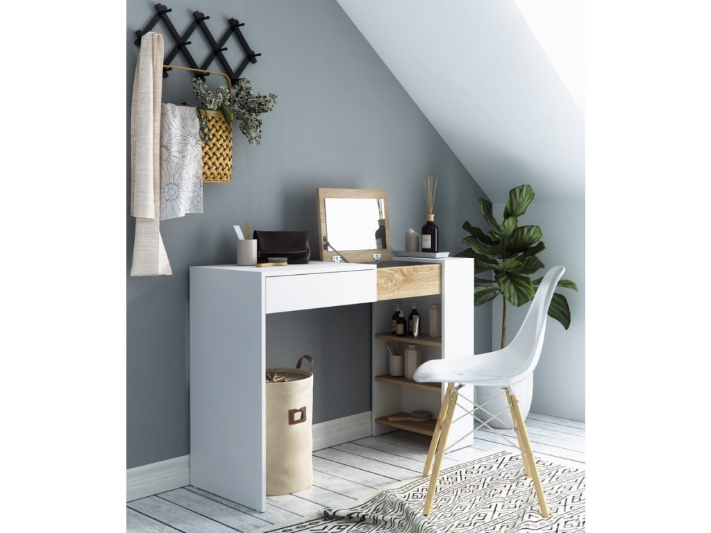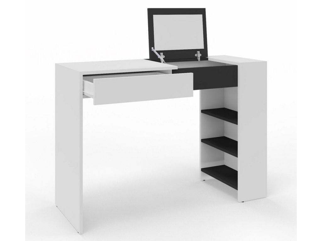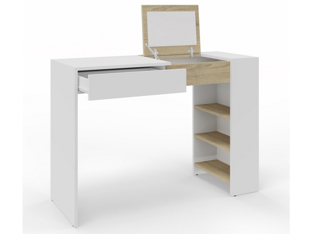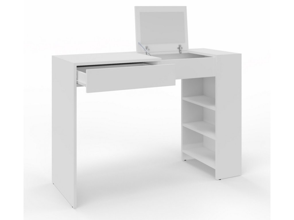 Toaletní stolek má klasický šuplík a druhý úložný prostor, kde je po otevření na vnitřní straně zrcadlo. Dalším bonusem jsou pak poličky v boční desce stolu. Tento stolek může sloužit také jako pracovní stůl. Stůl je vyroben z laminátové desky v barevném provedení bílá. Dodáváme v demontovaném stavu.Doplňkové parametry