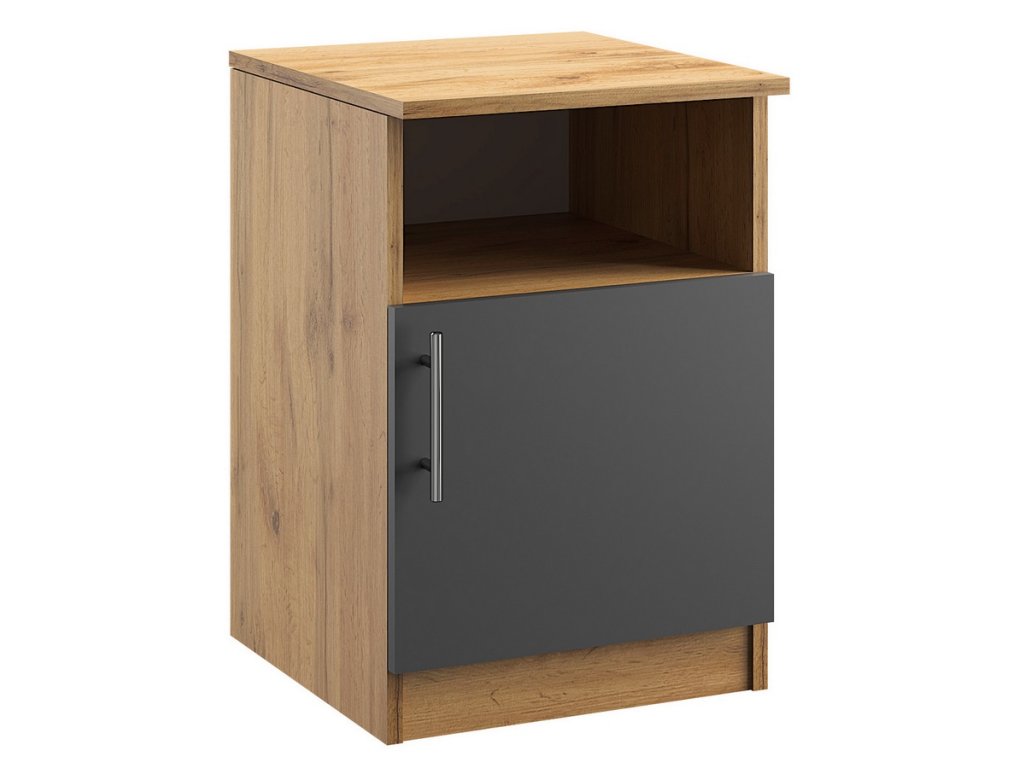 Komoda jednodveřová je vyrobena z LTD desky odolné vůči poškrábání v barvě dub apalačský, dvířka jsou v barvě šedá. Dodáváme v demontovaném stavu.Doplňkové parametry