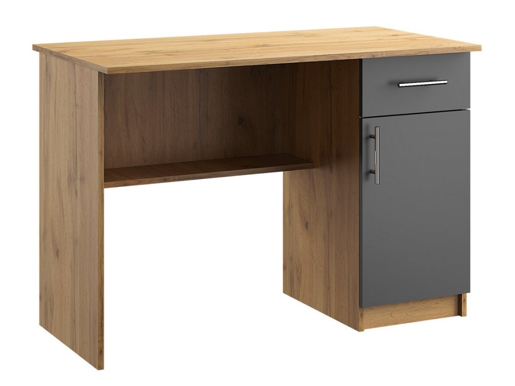 Praktický pracovní stůl se zásuvkou a dvířky je vyroben z LTD desky odolné vůči poškrábání v barvě dub apalačský, čelo zásuvky a dvířek je v barvě šedá, provedení pravé. Dodáváme v demontovaném stavu.Doplňkové parametry