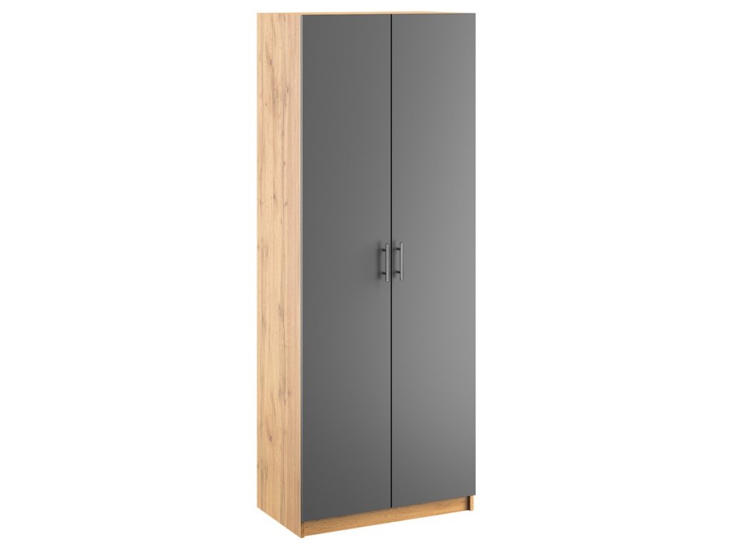 Skříň dvoudveřová je vyrobena z LTD desky odolné vůči poškrábání, korpus je v barvě dub apalačský, dvířka jsou v barvě antracit. Uvnitř se nachází 1 věšáková tyč a police. Dodáváme v demontovaném stavu.Doplňkové parametry