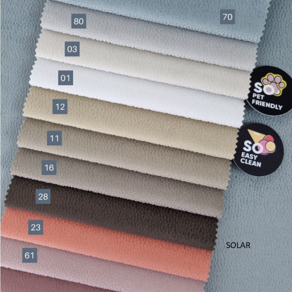 Popis látky: Látka Velo - je velmi měkká a na dotek příjemná látka . Látka je prodyšná, odolná proti UV záření, snadno se čistí, extrémně odolná proti nasákavosti a vysoká odolnost proti oděru.