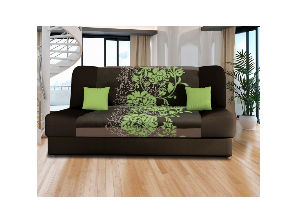 textilní potah, barevné provedení hnědá / zelená světlejší pruh a motiv květů na sedací a opěradlové části může být umístěn i v jiné poloze, než je na obrázku jádro z vlnité pružiny, výška sedu 40 cm, hloubka sedu 55 cm, rozměr rozložené 190 × 120 cm rozkládací s úložným prostorem, rozkládání KLIK-KLAK (postup uveden v návodu k montáži) po složení do polohy k sedu upravte krycí látku v zadní části tak, aby zakryla rozkládací mechanizmusDoplňkové parametry