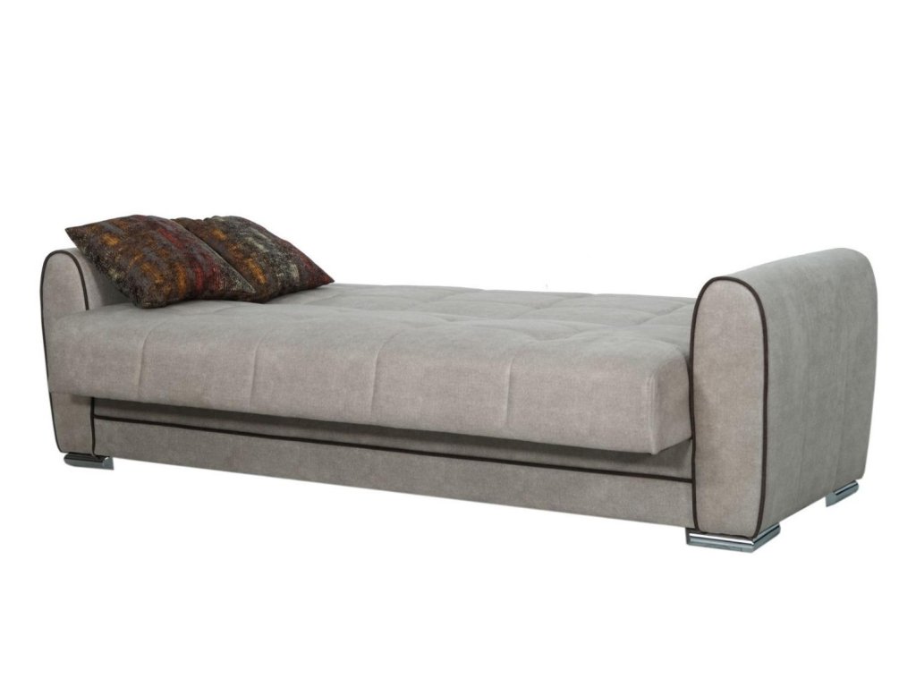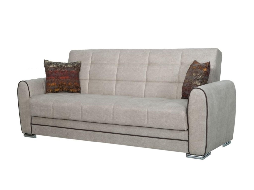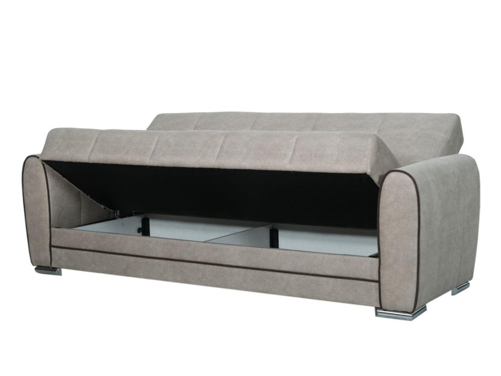 Třímístná pohovka s funkcí spaní a úložným prostorem bude praktickým kouskem do každého interiéru. Pohovka je ideální pro každodenní odpočinek, ale také vhodné místo ke spaní nejen pro Vás, ale i vaše hosty. Za komfort sezení a spaní jsou zodpovědné pružiny Bonnell a vysoce kvalitní PUR pěna. Úložný prostor pod sedákem poskytuje dostatek prostoru pro uskladnění ložního prádla či přikrývek. Pohovka je čalouněna kvalitní potahovou látkou v barvě ecru doplněné hnědým lem a dekoračními polštářky a stojí na chromových nožičkách. Specifikace: spací plocha po rozložení: 115 x 182 cm, celkové rozměry: Š:221/H:83/V:91 cm. K pohovce lze dokoupit i samostatné křeslo.Doplňkové parametry