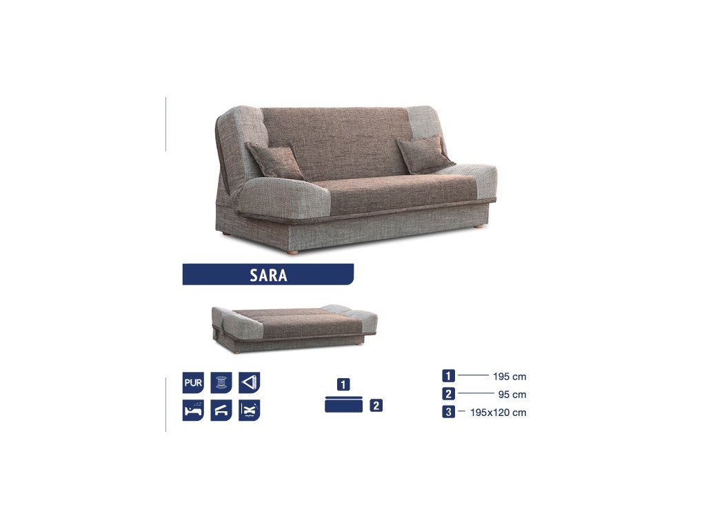 Rozkládací pohovka s kvalitním jádrem tvořeným vinutými pružinami a PUR pěnou je příjemným spojením elegantního designu, funkčnosti a atraktivní ceny. Disponuje praktickým úložným prostorem. Díky rozkládací konstrukci ji snadno přeměníte na lůžko o rozměrech 195x120 cm, které můžete kdykoliv nabídnout hostům, kteří u vás zůstanou přes noc.