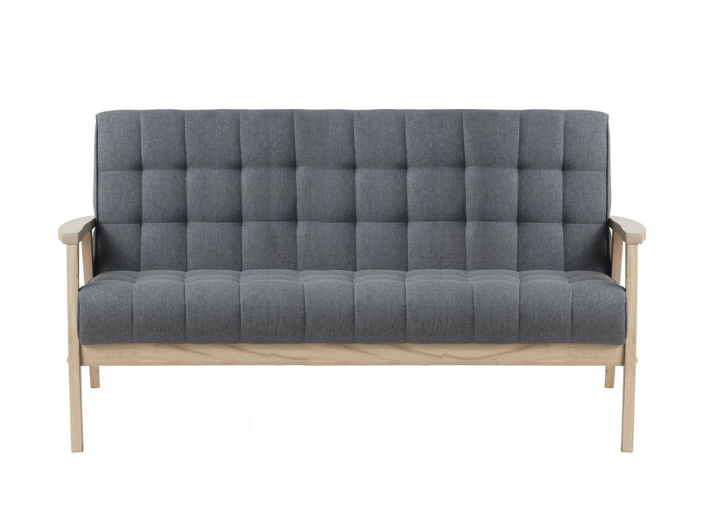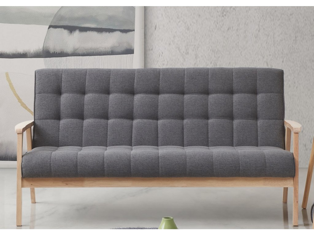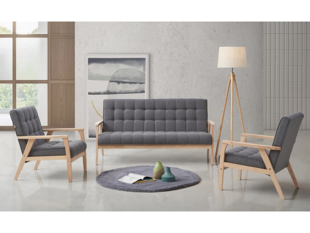 Elegantní trojsedák v retro stylu. Nohy a područe jsou ze dřeva Hevea v barvě bílá lazura. Trojsedák je potažen příjemnou látkou tmavě šedé barvy s atraktivním prošíváním ( celočalouněný - záda sedačky ve stejné látce jako sedák ). Pohodlné sezení zaručuje PUR pěna s pružnými čalounickými pásy. Výška sedu je 35 cm a hloubka sedu je 52 cm. Doporučujeme dokoupit křeslo ze stejné kolekce.Doplňkové parametry