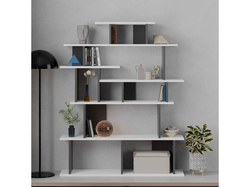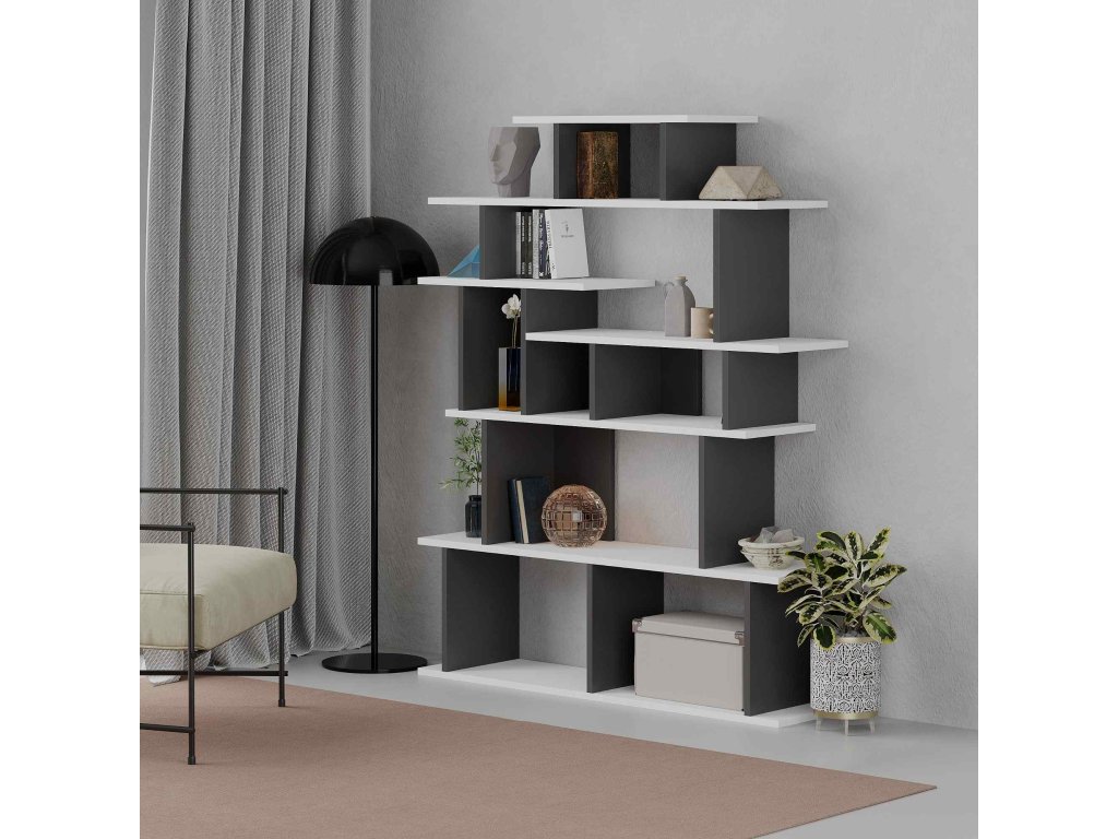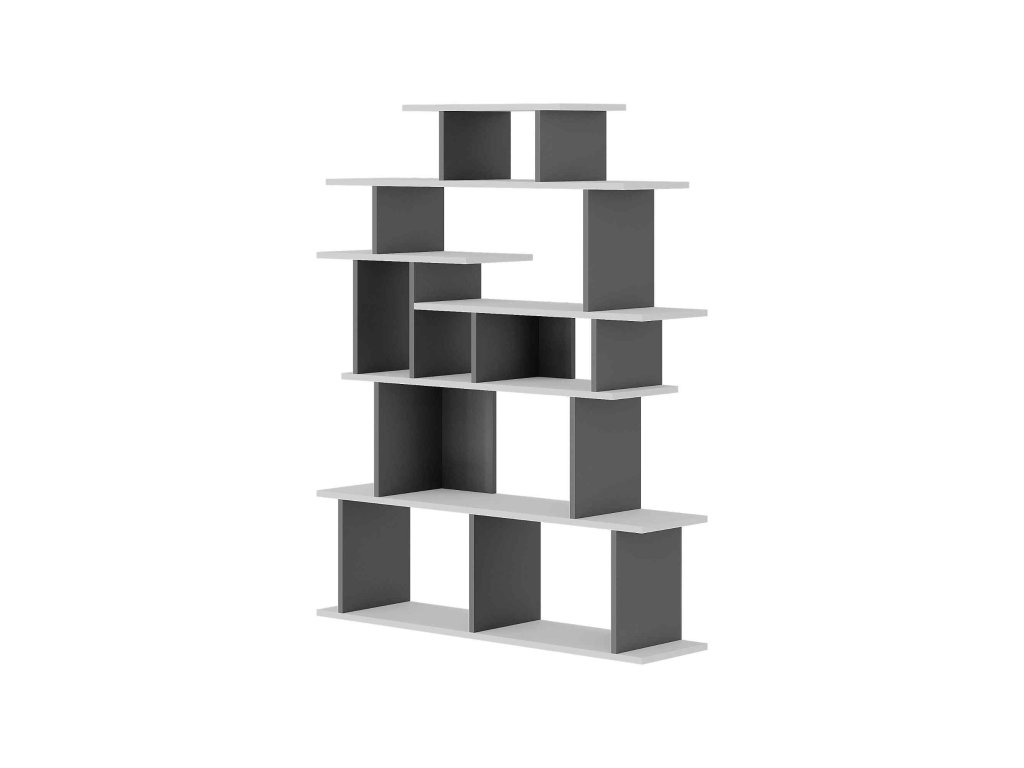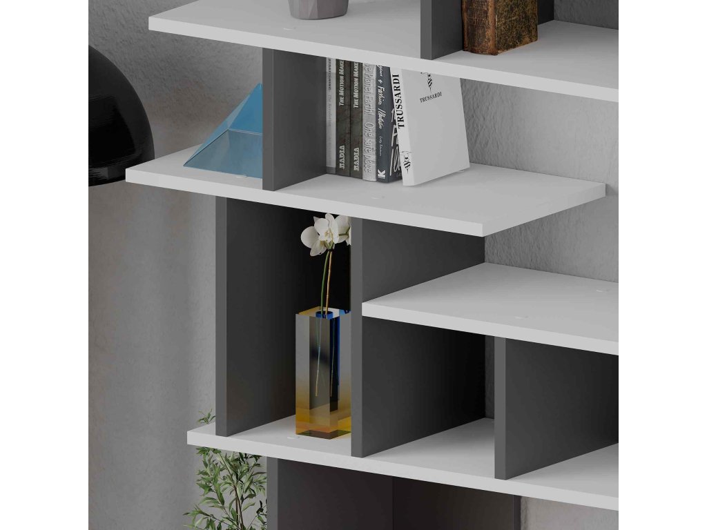Představujeme - moderní designový regál a knihovnu, který se stane nejen praktickým doplňkem, ale i výrazným designovým prvkem vašeho obývacího pokoje. Čisté linie a kontrastní kombinace bílé a antracitu zdůrazňují moderní styl tohoto nábytku.