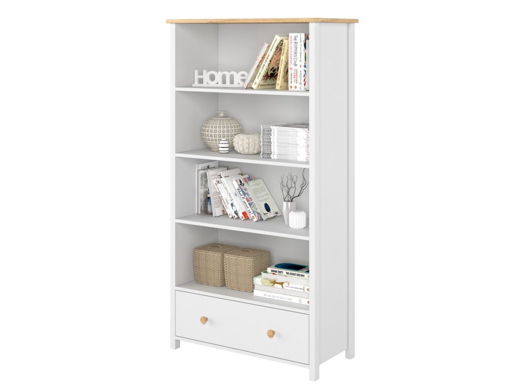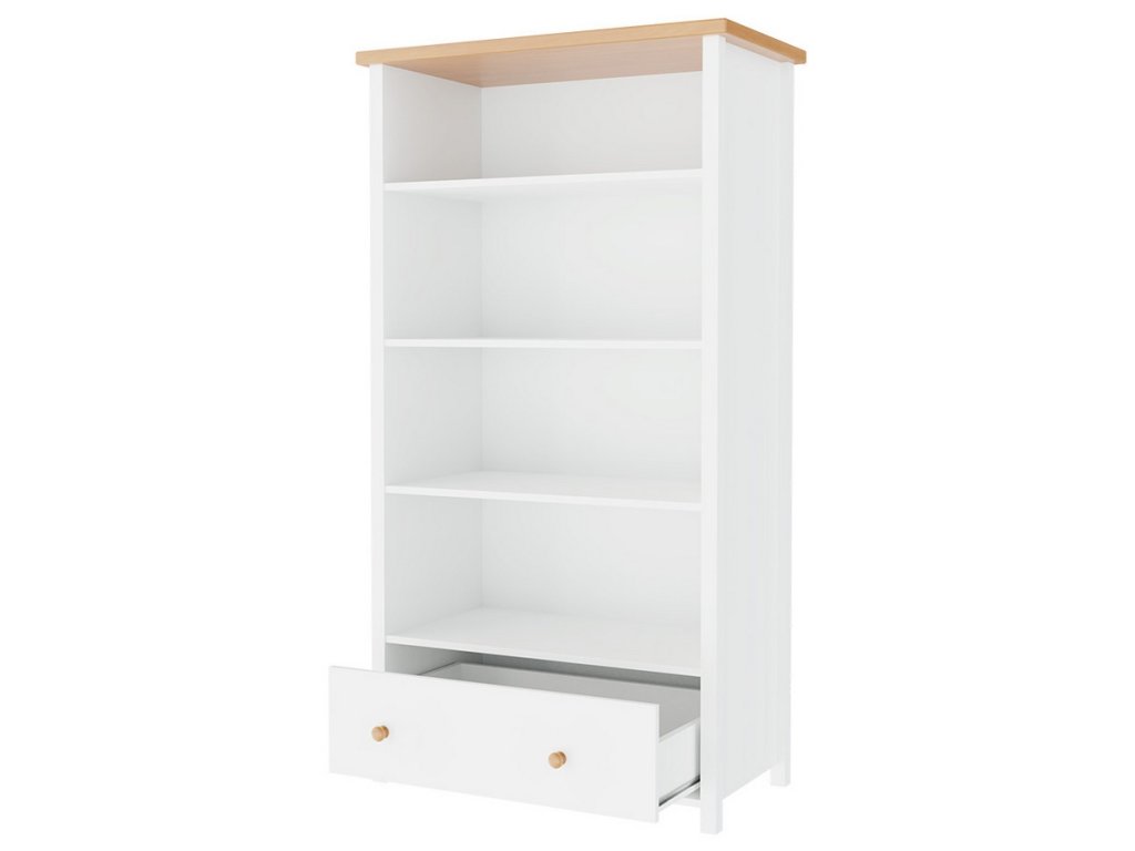 Knihovna se zásuvkou. Tento elegantní nábytek dodá romantickou atmosféru pokojíčku malé princezny i větší slečny. Knihovna je vyrobena z desky LTD v kombinaci s MDF v barvě bílé s doplňkovou barvou dub Nash ( 22 mm ). Ve spodní části knihovny je prostorná zásuvka. Úchyty jsou plastové v barvě dub nash. Dodáváme v demontovaném stavu.Doplňkové parametry