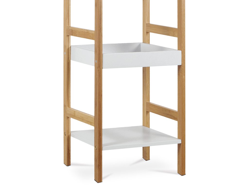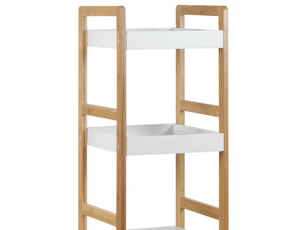 Regál s třemi policemi kombinuje pevnost masivního bambusu s bílým matným lakem MDF desek, což vytváří stabilní a zároveň esteticky příjemný kus nábytku. Bambusové bočnice v přírodním odstínu dodávají regálu přirozený vzhled a zajišťují pevnou oporu pro jednotlivé police. Dvě horní police jsou opatřeny zvýšenými okraji, které zabraňují sklouznutí uložených předmětů, zatímco spodní police je plochá a nabízí další úložný prostor. Díky nosnosti 9 kg na polici je regál vhodný pro lehčí dekorace, knihy či drobné předměty v interiéru. Kompaktní rozměry a jednoduchý design umožňují snadné umístění do různých prostorů, kde oceníte kombinaci funkčnosti a přírodního stylu.Doplňkové parametry