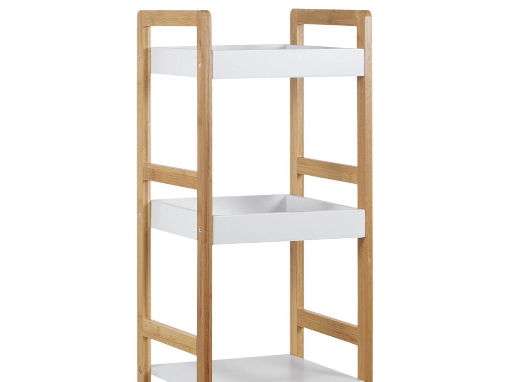 Regál s čtyřmi policemi kombinuje pevný rám z masivního bambusu v přírodním odstínu s policemi z MDF desek opatřených bílým matným lakem. Tento materiálový mix zajišťuje stabilitu a zároveň moderní vzhled vhodný do různých interiérů. Police jsou navrženy tak, aby unesly zatížení až 12 kg, což umožňuje bezpečné uložení dekorací, knih nebo drobných předmětů. Otevřená konstrukce regálu podporuje snadný přístup a přehlednost uložených věcí. Kompaktní rozměry a decentní barevné provedení umožňují univerzální využití v domácnostech i kancelářích.Doplňkové parametry