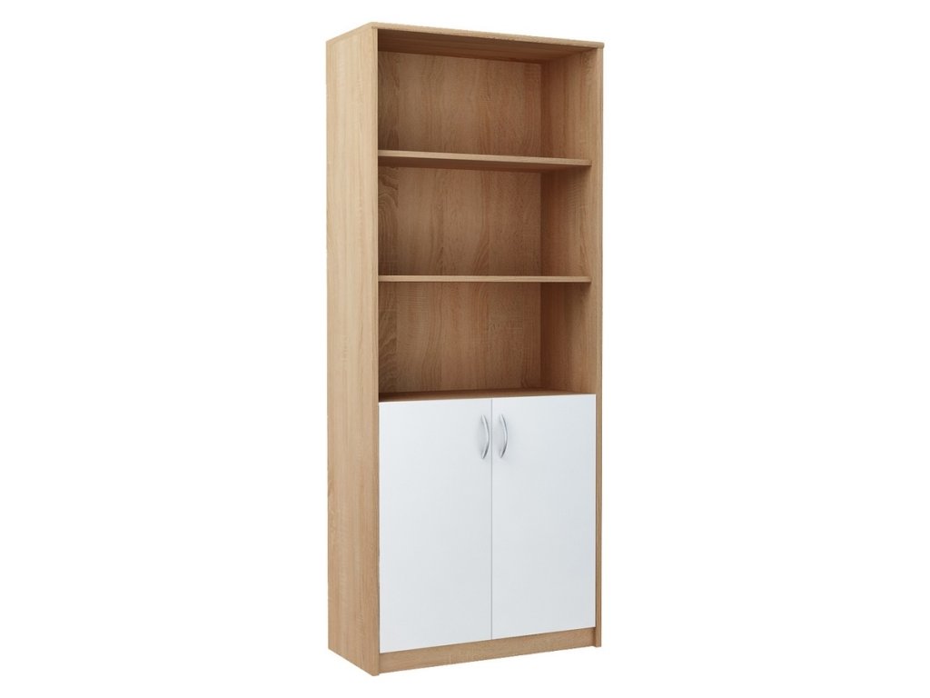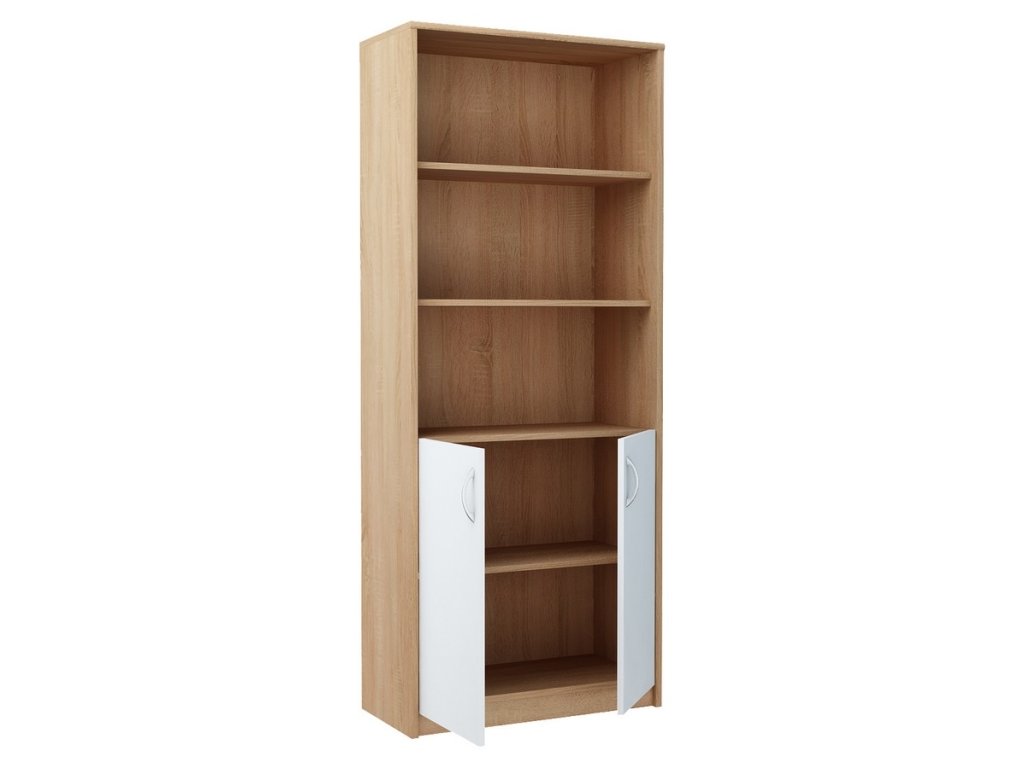 Regál s dvířky. Korpus i dvířka jsou z kvalitního lamina. Lamino je odolné proti poškrábání, poškození, vlhkosti a vysokým teplotám. Korpus je v barevném provedení dub sonoma a dvířka jsou v bílé matné barvě. Dodáváme v demontovaném stavu.Doplňkové parametry