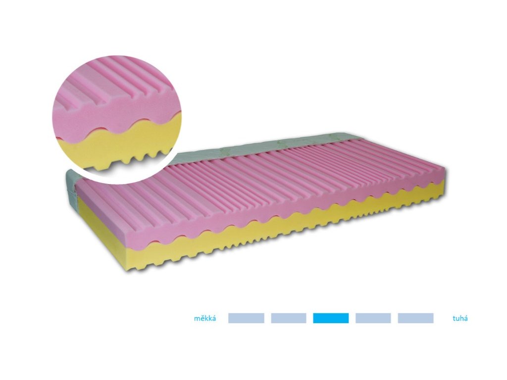 Výška matrace je cca 16 cm. Nosnost matrace 110 kg.Froté pratelný potah na 60°. Sendvičová 7-zónová matrace, střed je z pojeného polyuretanu a dvě desky s masážními nopy, které zajišťují vzdušnosta velmi kvalitní spánkový komfort