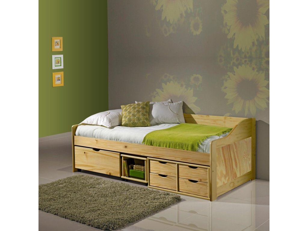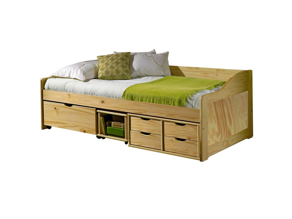materiál masiv borovice, lakované provedení praktické úložné prostory pod postelí (zásuvky a otevřená police) v ceně výška sedu 50 cm, cena včetně roštu (dřevěný laťkový), matrace není v ceně doporučený rozměr matrace 90 × 200 cm (M2, M5, M9, M12, M24, M26) jako vhodný doplněk doporučujeme čalouněný válec M10 hloubka široké zásuvky 65,5 cm, hloubka malých zásuvek 39 cm, hloubka otevřené police 44,5 cmDoplňkové parametry