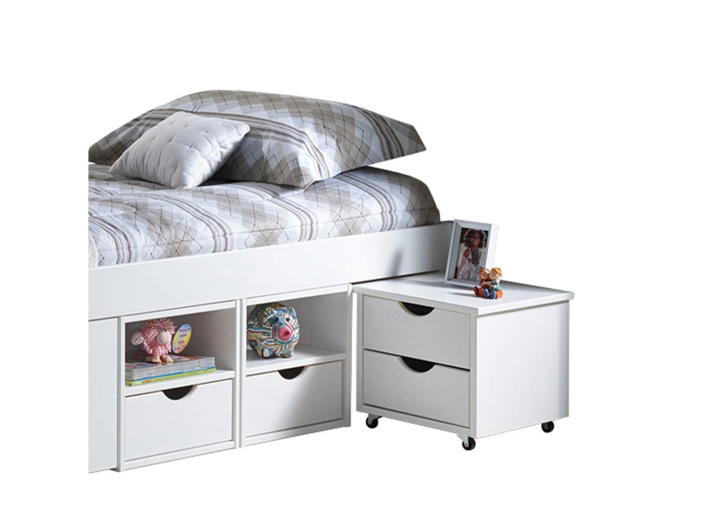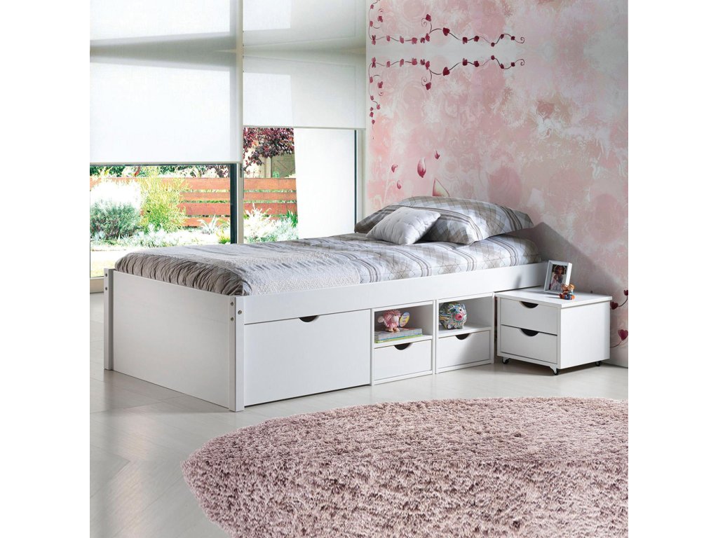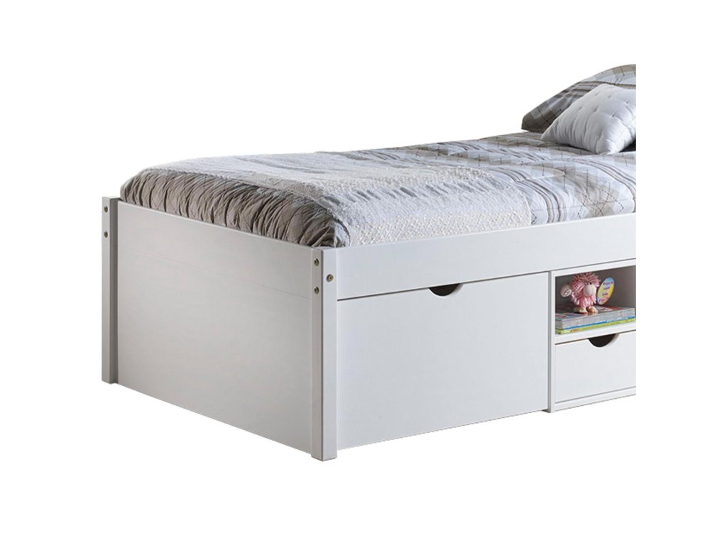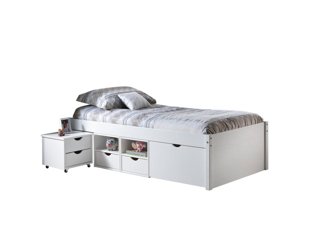 materiál masiv borovice, barevné provedení bílý lak praktické úložné prostory pod postelí, výsuvný noční stolek a rošt jsou v ceně matrace není v ceně, doporučený rozměr matrace 90 × 200 cm (M2, M5, M24, M26, M34, M35)Doplňkové parametry