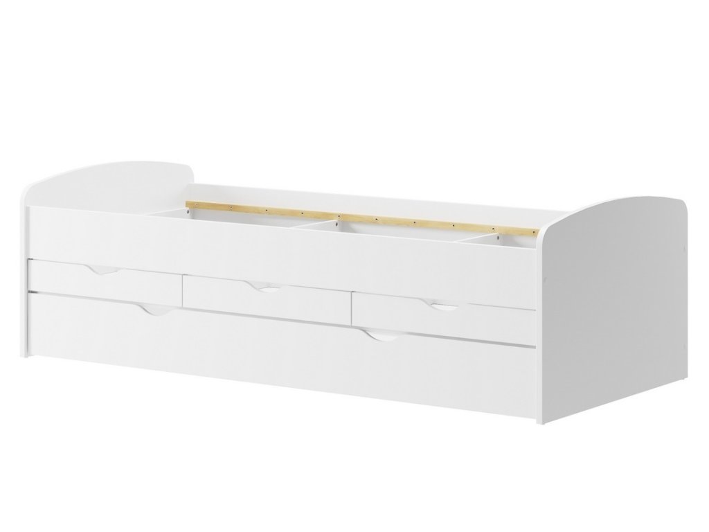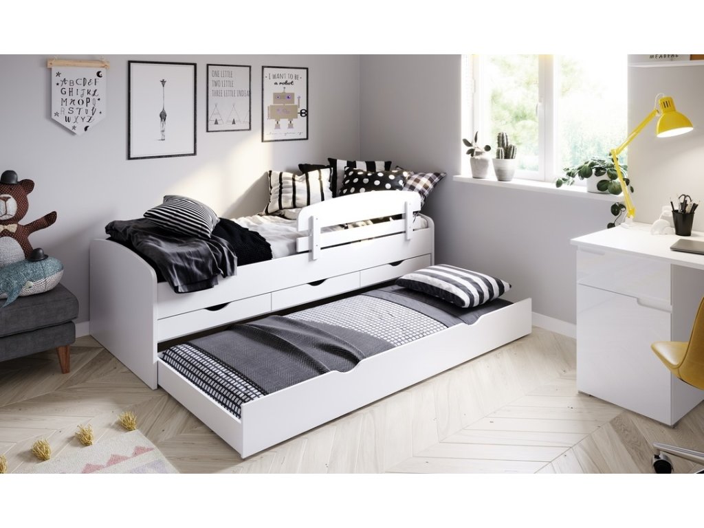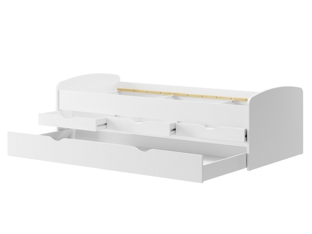 Postel 90x200 cm se třemi zásuvkami. Postel je vyrobena z kvalitní LTD desky v barvě bílá mat. Pod třemi zásuvkami je další jedna velká zásuvka, kterou je možné využít jako úložný prostor, nebo po vložení matrace jako další prostor ke spaní. Doporučujeme dokoupit bariéru k posteli, ta není v ceně. Dodáváme v demontovaném stavu.Doplňkové parametry