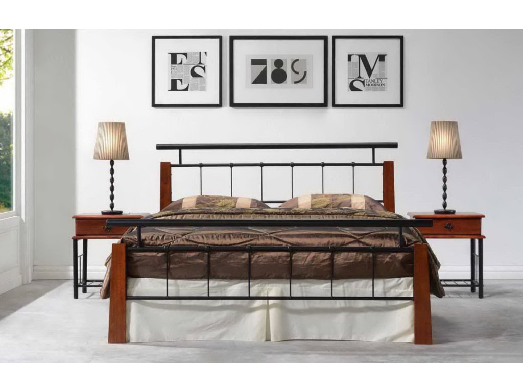 Popis postele - Elegantní postel v klasickém stylu. Zajímavá kombinace kovu a dřeva. Kvalitní masivní dřevo je v barevném provedení antická třešeň. Rám je kovový, tak jako i originální mříže v černé barvě na předním i zadním čele. Dřevěné lamely jsou vsazeny do kovového rámu postele. Rošt je cca 27,6 cm nad zemí. Výška při nohách - 63 cm. Rozměry postele - výška 103,7 cm, hloubka 210 cm a šířka 190 cm.