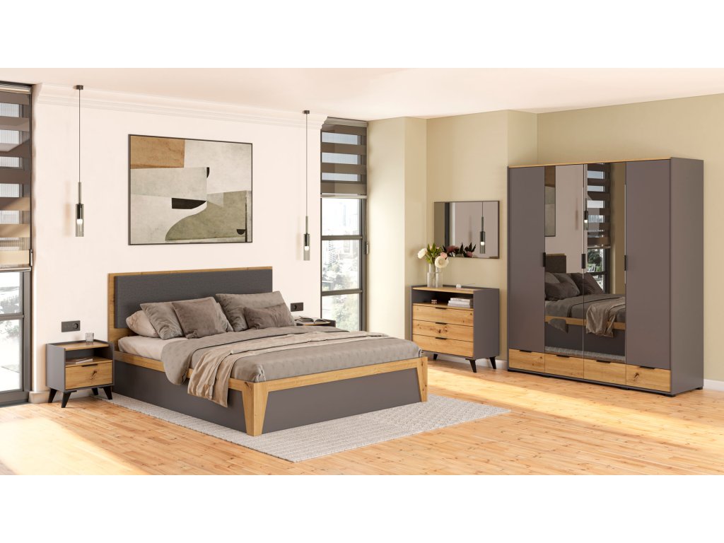 Nábytek do ložnice představuje stylovou kolekci nábytku, která umožní komfortní vybavení ložnice. Vysoká funkčnost jednotlivých součástí a atraktivní design jsou zárukou zákazníkovy spokojenosti. Celkové rozměry: 1690 x 1000 x 2060 mm Barevné provedení: dub Artisan / grafit Materiál: 16 mm LTD Nábytek dodáváme v demontu s návodem k montáži.