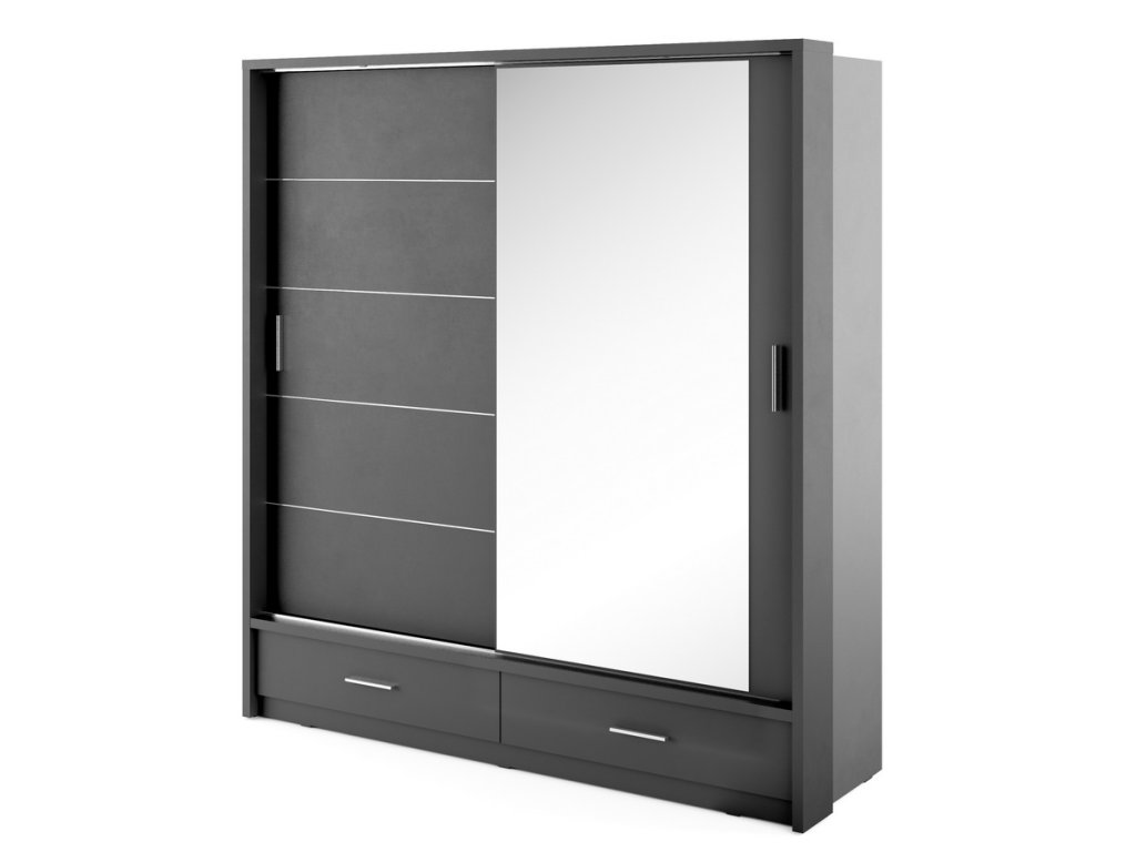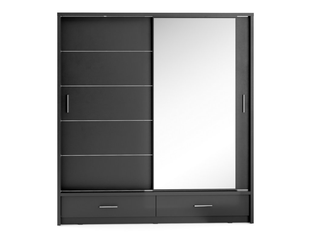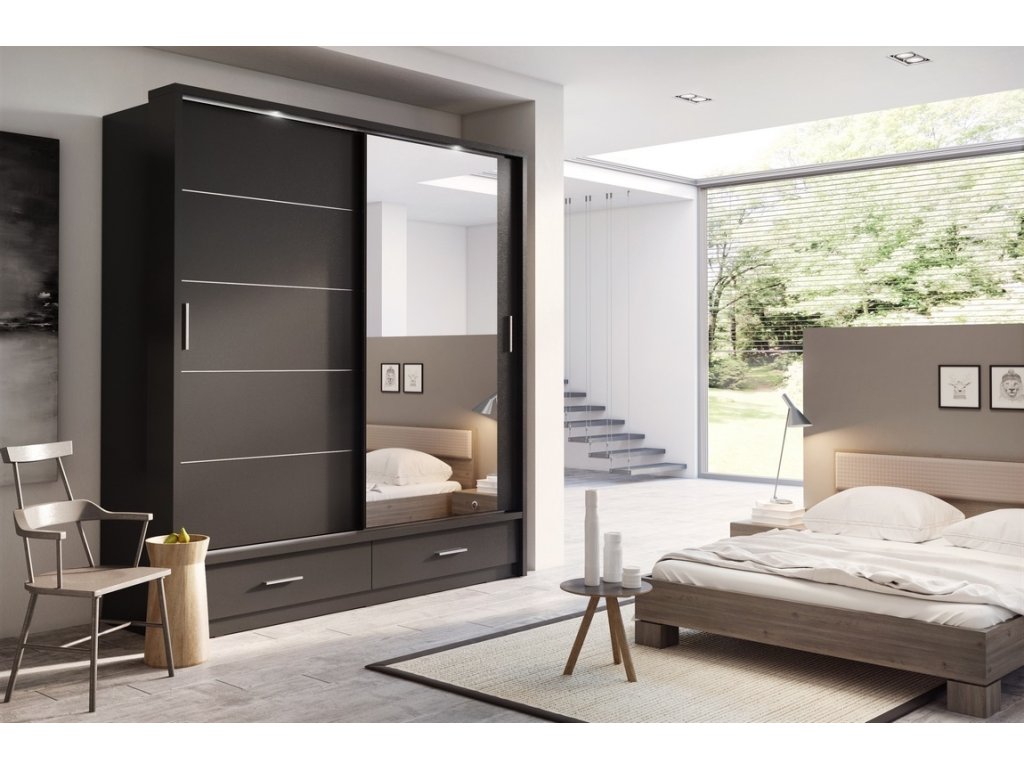Šatní skříň dvoudveřová s posuvnými dveřmi v moderním provedení. Dole jsou dvě zásuvky. Korpus a dveře jsou z kvalitního LTD v černé matné barvě. Jedny dveře jsou osazeny zrcadlem. Hrany u skříně jsou ohraničeny ABS páskou. LED osvětlení je v ceně. Dodáváme v demontovaném stavu.Doplňkové parametry