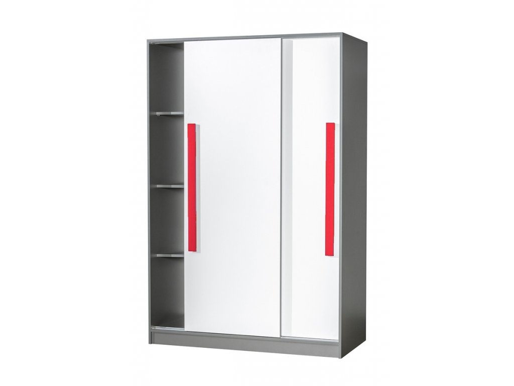 Šatní skříň s posuvnými dveřmi ze sektorové řady GYT, která se vyznačuje netradičním zpracováním barev a originalitou úchytů. Tento styl nábytku zaujme každou mladší generaci. Skříň je vyrobena z kvalitní LTD desky hraněné ABS lištou. Korpus je v barvě šedá antracit, dveře jsou bílé matné. Úchytky jsou v červené barvě. Uvnitř skříně je šatníková tyč a police. Sektorový nábytek GYT má široký výběr prvků, který Vám zaručí sestavit si dětský nebo studentský pokoj, ložnici či kancelář podle svých potřeb, přání a představ. Dodáváme v demontovaném stavu.Doplňkové parametry
