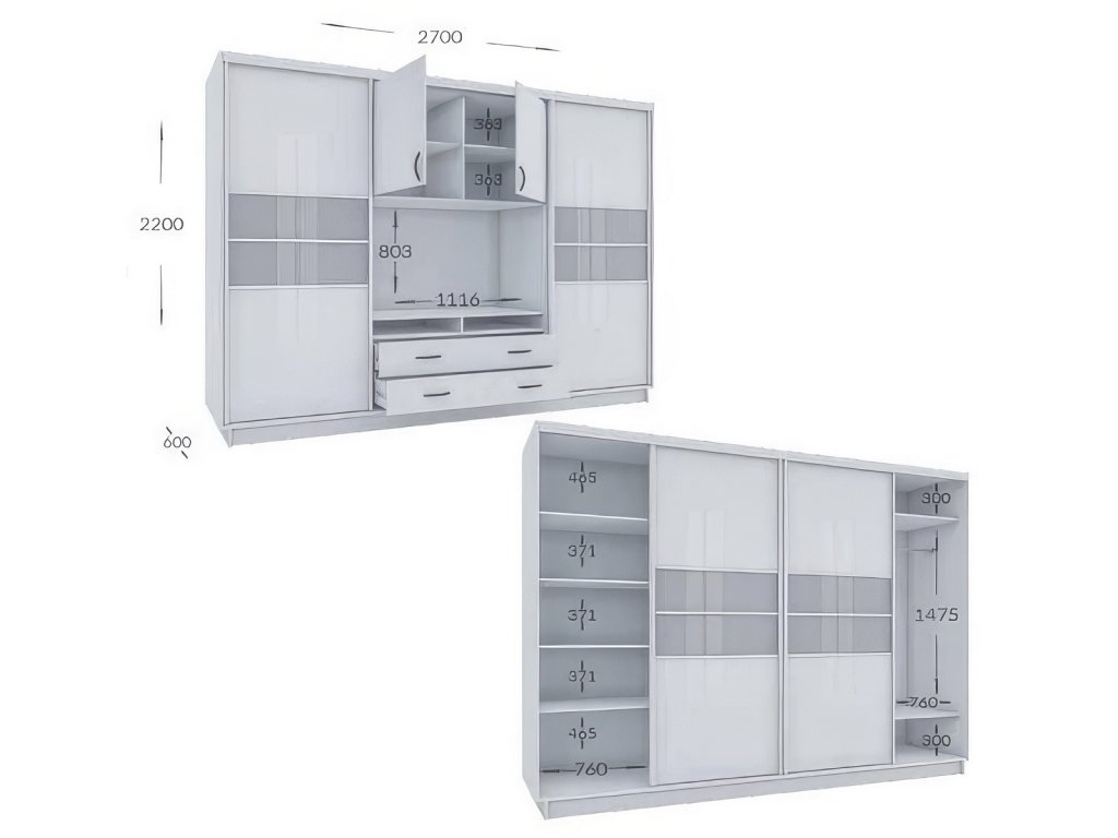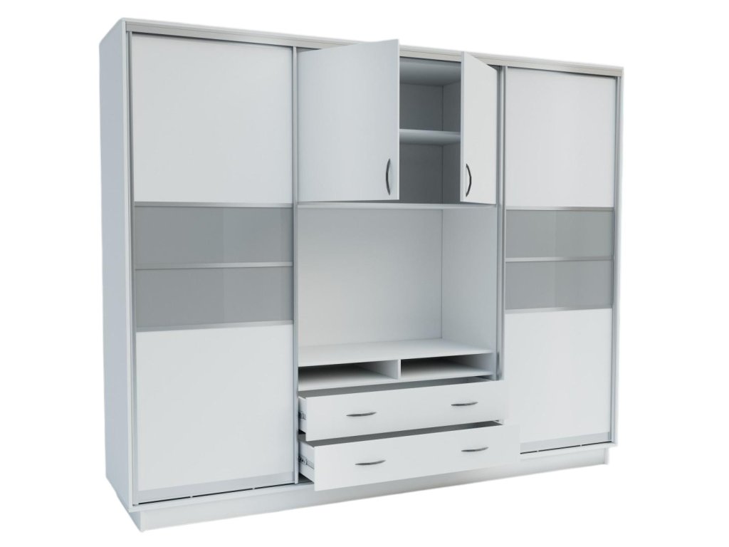 Obývací stěna/šatní skříň s posuvnými dveřmi v moderním a vyjimečném provedení. Je vhodná jak do ložnice, tak do obývacího pokoje pro efektivní využití prostoru. Nezvyklá výška 220 cm a šířka 270 cm Vám nabídne opravdu velký úložný prostor. Skříň navíc v prostřední části nabízí v celku obyvací stěnu - prostor pro TV, pak má praktickou vrchní dvoudveřovou skříňku a ve spodní části dvě prostorné zásuvky. Rozměry na obrázku. Barevné provedení je bílá, dvířka jsou v bílém lesku s dekorativními tříbrno-šedými pásy. Dodáváme v demontovaném stavu.