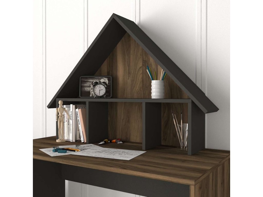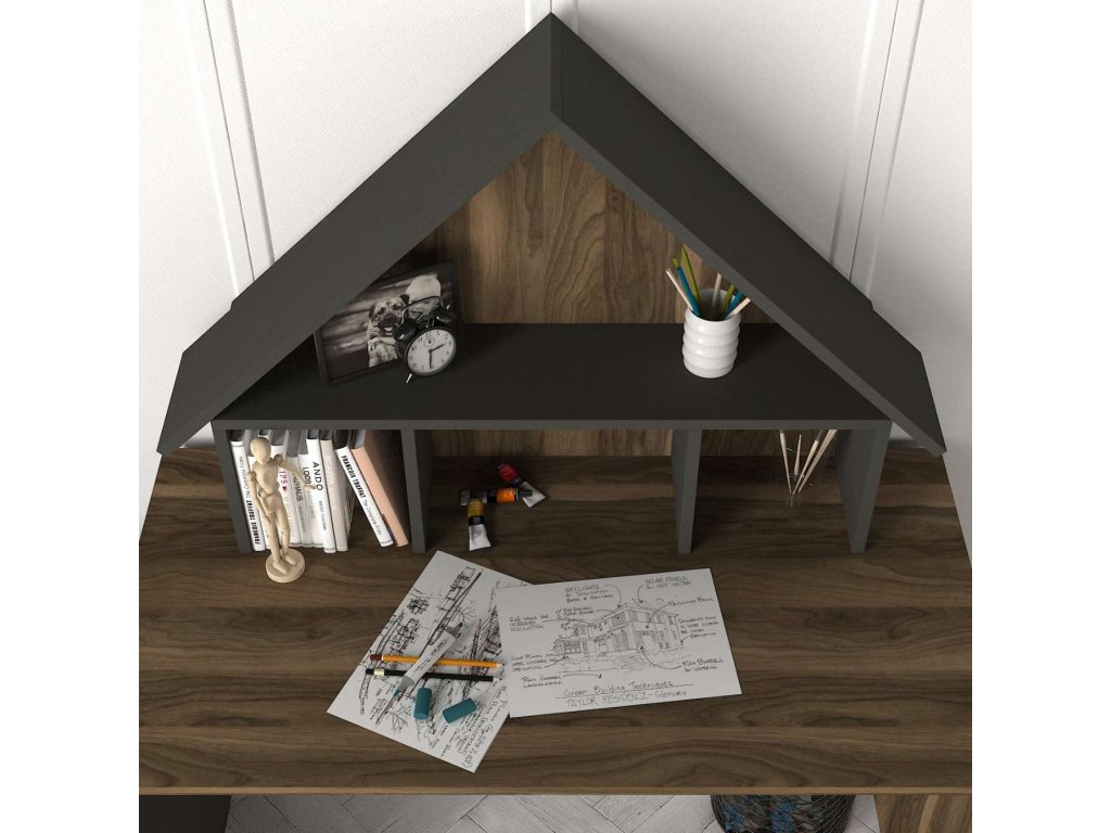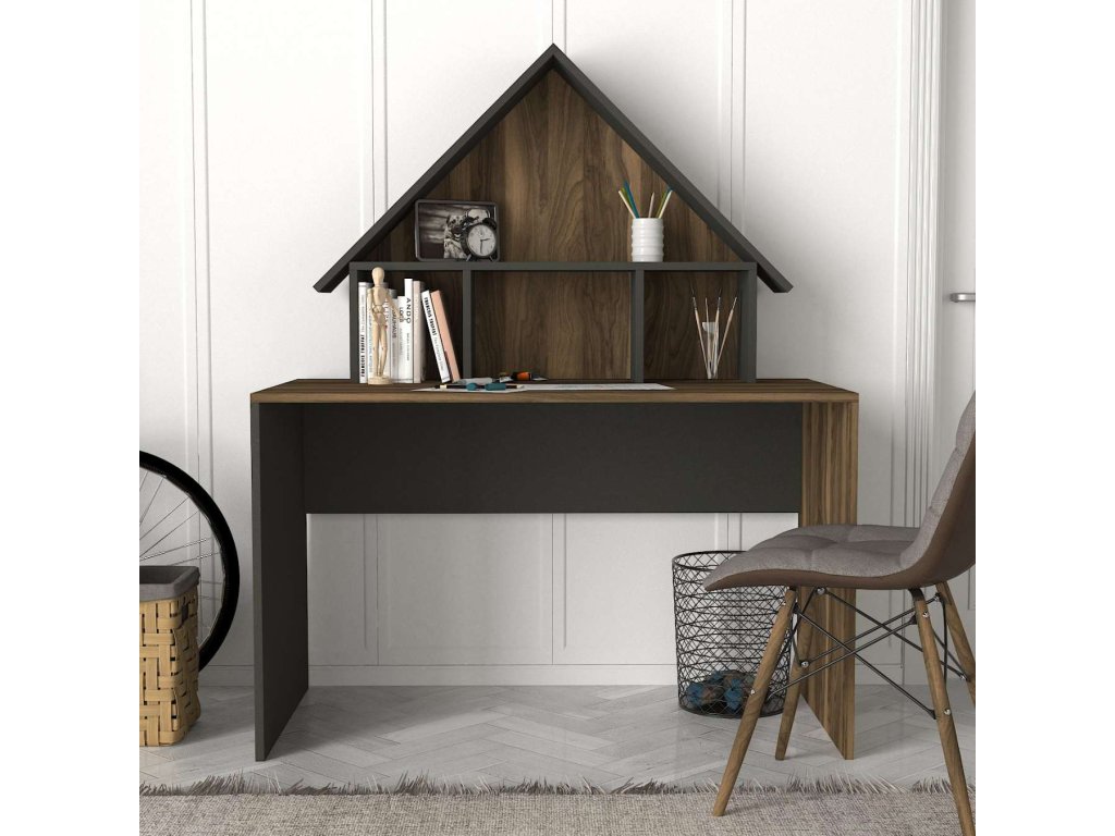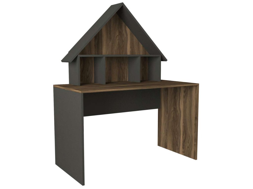 Písací stůl je vyroben z kvalitního LTD materiálu s tloušťkou 18 mm, což zajišťuje jeho pevnost a dlouhou životnost. Elegantní kombinace ořechové a antracitové barvy dodává stolu moderní a sofistikovaný vzhled, který se hodí do jakéhokoliv interiéru. Stůl je vybaven praktickým regálkem a nástavcem, které poskytují dostatek úložného prostoru pro vaše pracovní potřeby a pomůcky.