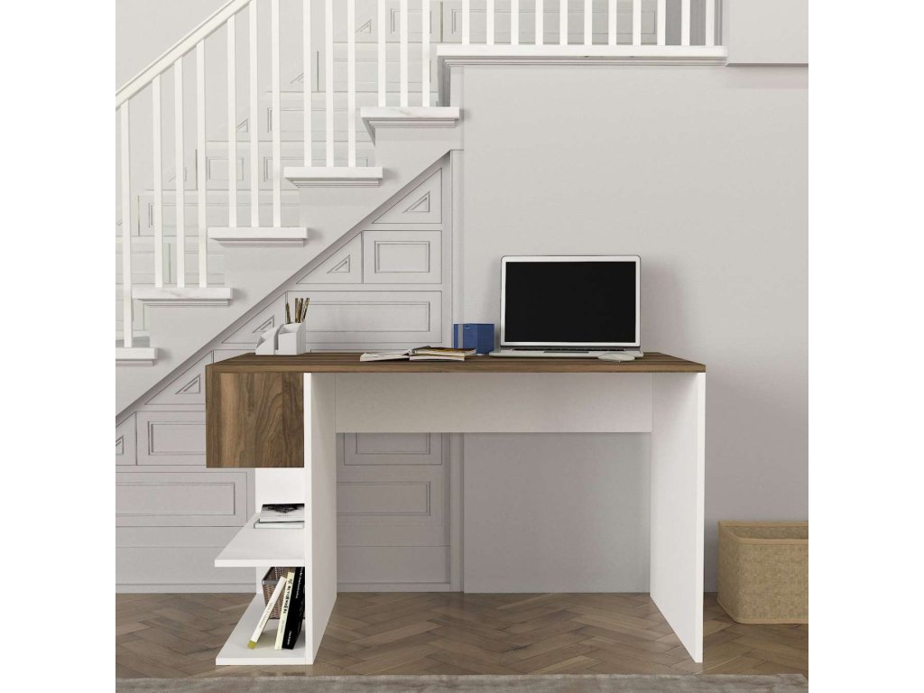 Stůl je vyroben z kvalitního LTD materiálu s tloušťkou 18 mm, což zajišťuje jeho pevnost a dlouhou životnost. Elegantní kombinace bílé a ořechové barvy dodává stolu moderní a stylový vzhled, který se hodí do jakéhokoliv interiéru. Stůl je vybaven praktickým regálkem, který poskytuje dostatek úložného prostoru pro vaše pracovní potřeby a pomůcky.